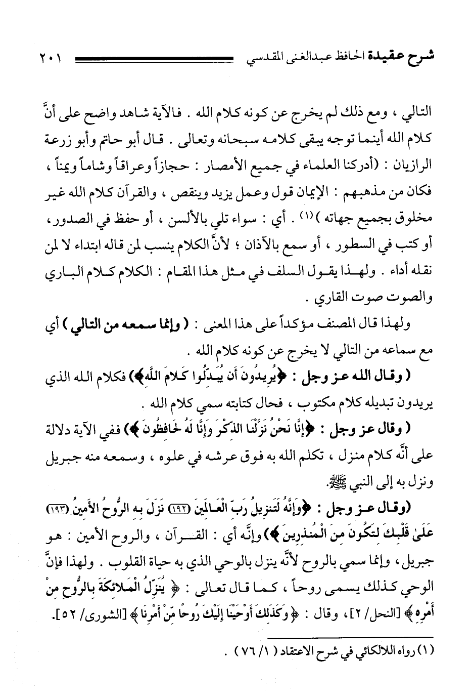 " وقال عز وجل: {إِنَّا نَحْنُ نَزَّلْنَا الذِّكْرَ وَإِنَّا لَهُ لَحَافِظُونَ} " ففي الآية دلالة على أنَّه كلام منزل، تكلم الله به فوق عرشه في علوه، وسمعه منه جبريل ونزل به إلى النبي صلى الله عليه وسلم.