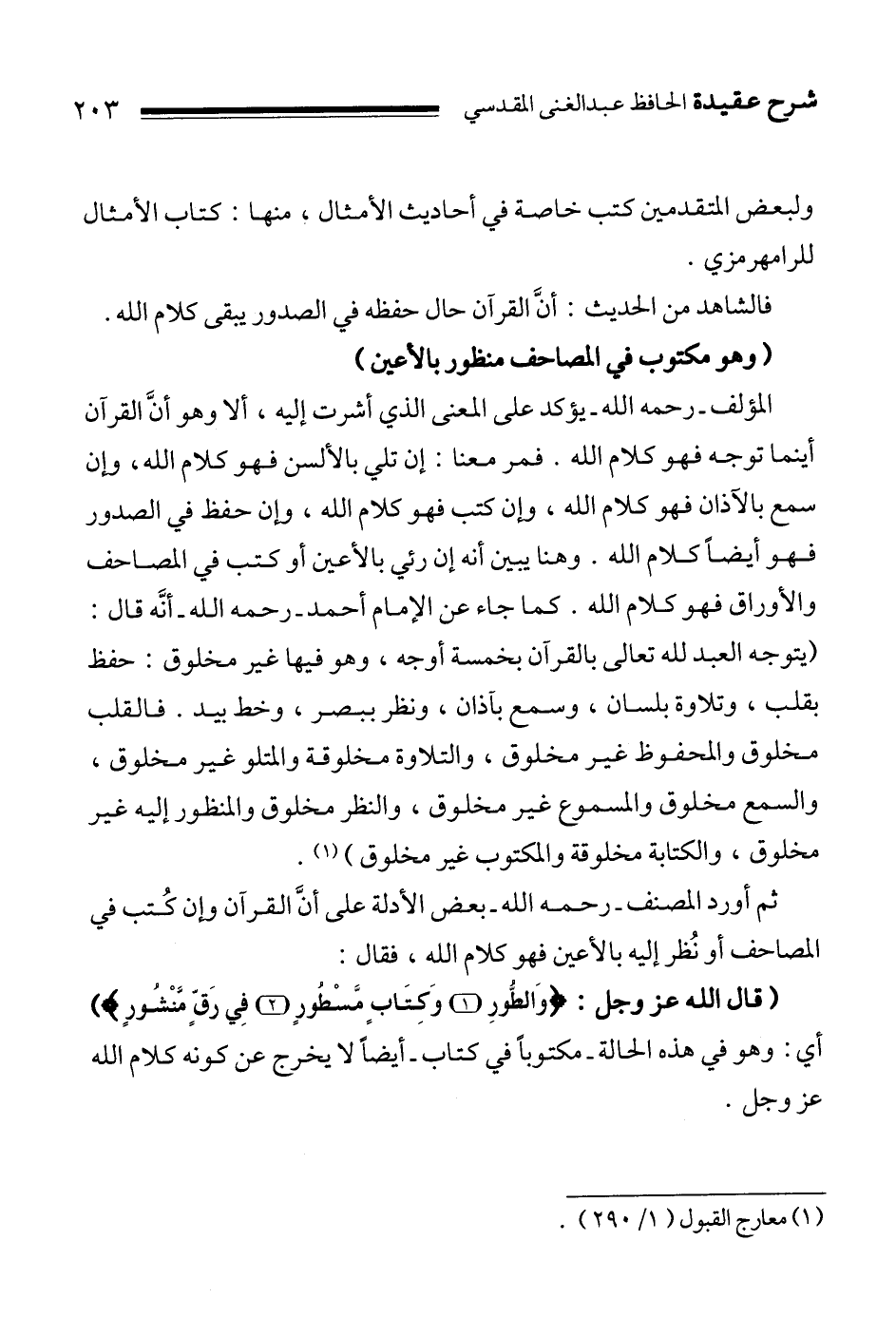 المؤلف ـ رحمه الله ـ يؤكد على المعنى الذي أشرت إليه، ألا وهو أنَّ القرآن أينما توجه فهو كلام الله. فمر معنا: إن تلي بالألسن فهو كلام الله، وإن سمع بالآذان فهو كلام الله، وإن كتب فهو كلام الله، وإن حفظ في الصدور فهو أيضاً كلام الله. وهنا يبين أنه إن رئي بالأعين أو كتب في المصاحف والأوراق فهو كلام الله. كما جاء عن الإمام أحمد ـ رحمه الله ـ أنَّه قال:"يتوجه العبد لله تعالى بالقرآن بخمسة أوجه، وهو فيها غير مخلوق: حفظ بقلب، وتلاوة بلسان، وسمع بآذان، ونظر ببصر، وخط بيد. فالقلب مخلوق والمحفوظ غير مخلوق، والتلاوة مخلوقة والمتلو غير مخلوق، والسمع مخلوق والمسموع غير مخلوق، والنظر مخلوق والمنظور إليه غير مخلوق، والكتابة مخلوقة والمكتوب غير مخلوق"1.