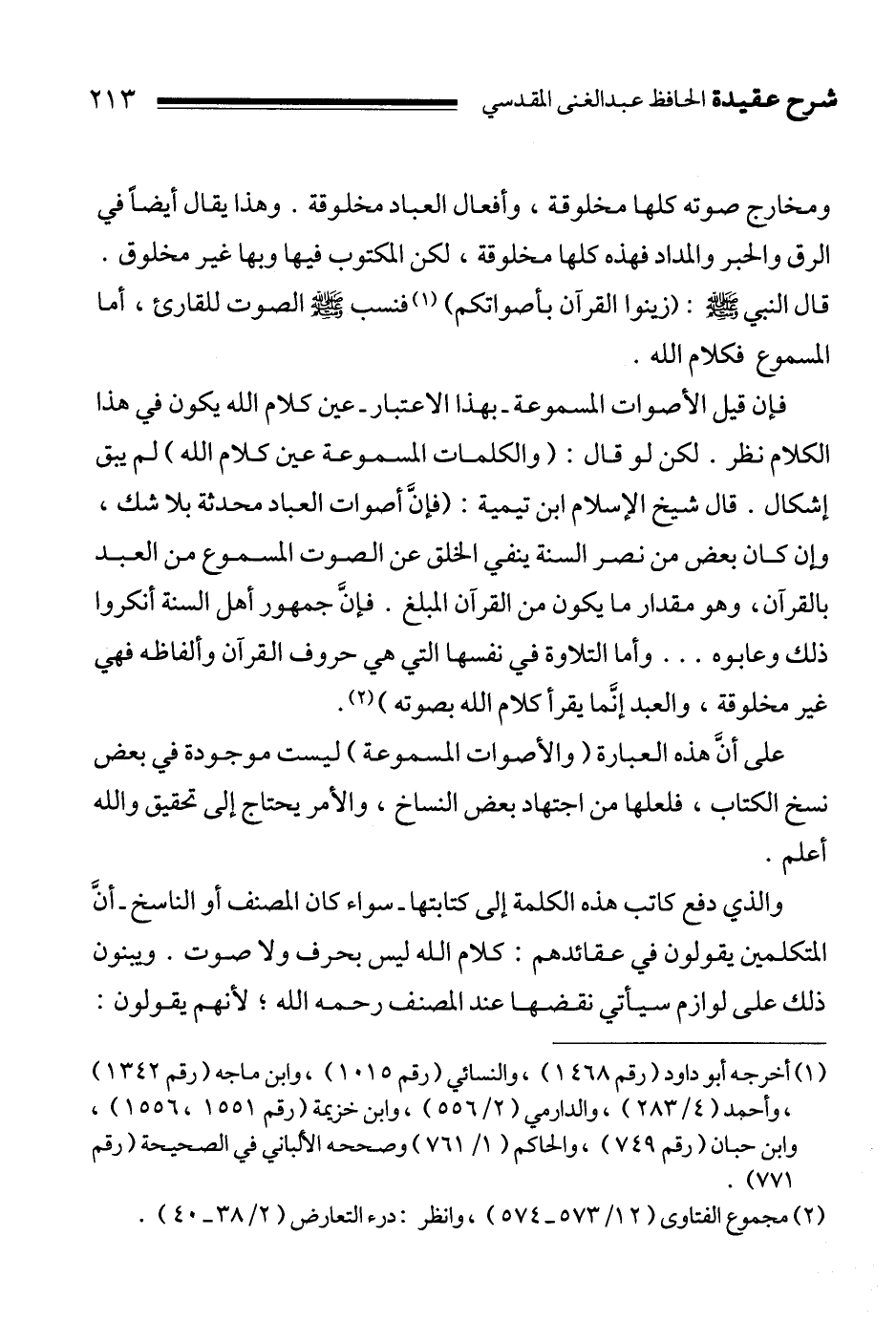 فإن قيل الأصوات المسموعة ـ بهذا الاعتبار ـ عين كلام الله يكون في هذا الكلام نظر. لكن لو قال: " والكلمات المسموعة عين كلام الله " لم يبق إشكال. قال شيخ الإسلام ابن تيمية:"فإنَّ أصوات العباد محدثة بلا شك، وإن كان بعض من نصر السنة ينفي الخلق عن الصوت المسموع من العبد بالقرآن، وهو مقدار ما يكون من القرآن المبلغ. فإنَّ جمهور أهل السنة أنكروا ذلك وعابوه ... وأما التلاوة في نفسها التي هي حروف القرآن وألفاظه فهي غير مخلوقة، والعبد إنَّما يقرأ كلام الله بصوته"2.