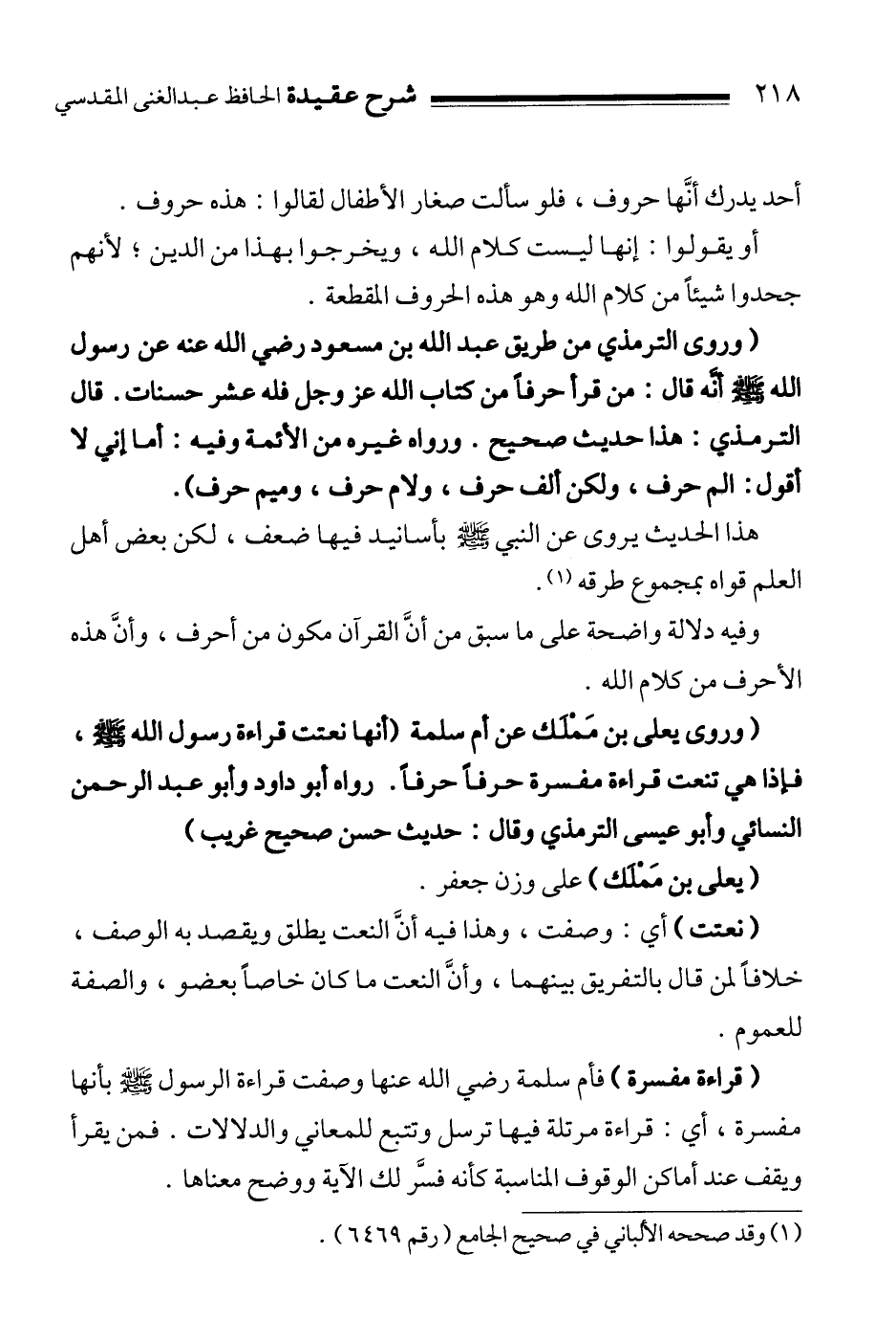 " وروى الترمذي من طريق عبد الله بن مسعود رضي الله عنه عن رسول الله صلى الله عليه وسلم أنَّه قال:"من قرأ حرفاً من كتاب الله عز وجل فله عشر حسنات" قال الترمذي: هذا حديث صحيح. ورواه غيره من الأئمة وفيه:"أما إني لا أقول: الم حرف، ولكن ألف حرف، ولام حرف، وميم حرف""