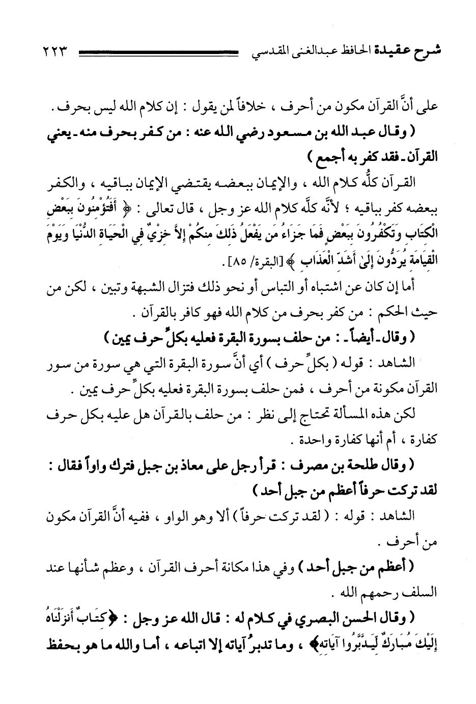 " وقال عبد الله بن مسعود رضي الله عنه: من كفر بحرف منه ـ يعني القرآن ـ فقد كفر به أجمع "