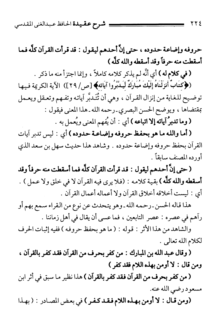" حتى إنَّ أحدهم ليقول: قد قرأت القرآن كلَّه فما أسقطت منه حرفاً وقد أسقطه والله كلَّه " بقية كلامه:"فلا يرى فيه القرآن لا في خلق ولا عمل". أي: ليست أخلاقه أخلاق القرآن ولا أعماله أعمال القرآن.