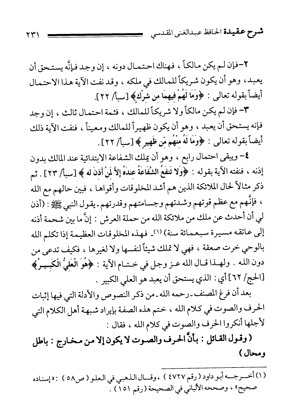 بعد أن فرغ المصنف ـ رحمه الله ـ من ذكر النصوص والأدلة التي فيها إثبات الحرف والصوت في كلام الله، ختم هذه الصفة بإيراد شبهة أهل الكلام التي لأجلها أنكروا الحرف والصوت في كلام الله، فقال: