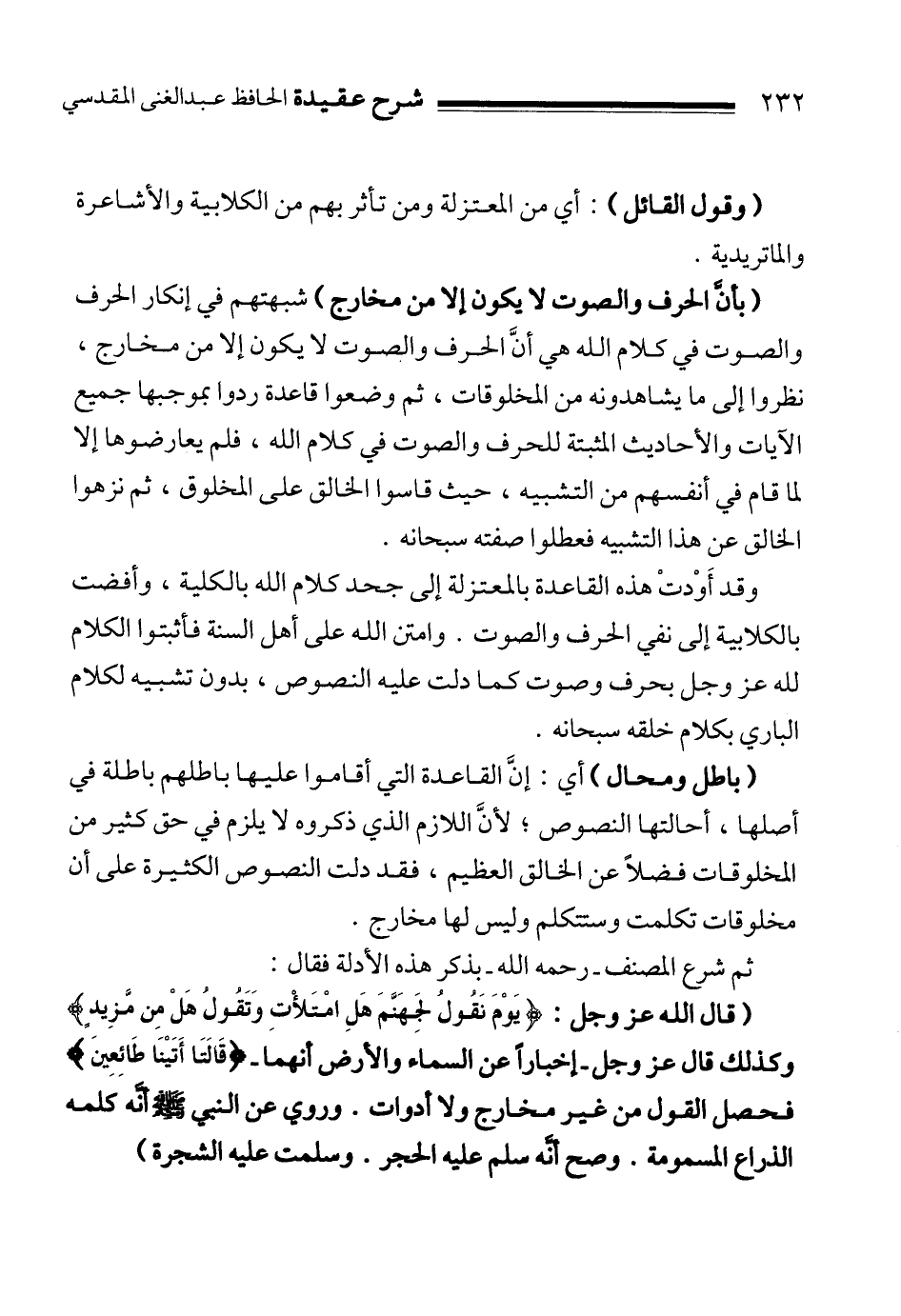 " بأنَّ الحرف والصوت لا يكون إلا من مخارج " شبهتهم في إنكار الحرف والصوت في كلام الله هي أنَّ الحرف والصوت لا يكون إلا من مخارج، نظروا إلى ما يشاهدونه من المخلوقات، ثم وضعوا قاعدة ردوا بموجبها جميع الآيات والأحاديث المثبتة للحرف والصوت في كلام الله، فلم يعارضوها إلا لما قام في أنفسهم من التشبيه، حيث قاسوا الخالق على المخلوق، ثم نزهوا الخالق عن هذا التشبيه فعطلوا صفته سبحانه.