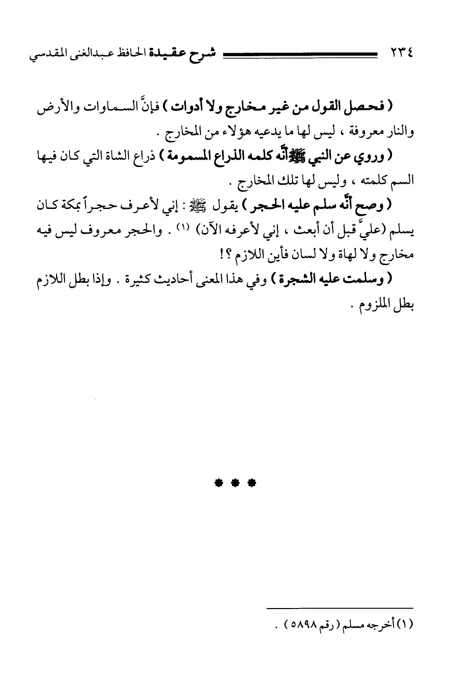 " وصح أنَّه سلم عليه الحجر " يقول صلى الله عليه وسلم:"إني لأعرف حجراً بمكة كان يسلم عليَّ قبل أن أبعث، إني لأعرفه الآن"1. والحجر معروف ليس فيه مخارج ولا لهاة ولا لسان فأين اللازم؟!
