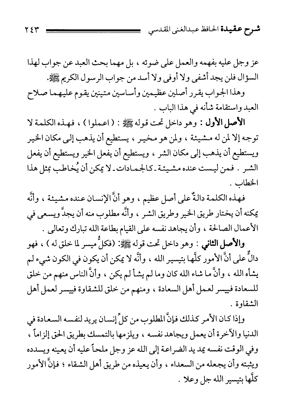 والأصل الثاني: وهو داخل تحت قوله صلى الله عليه وسلم: " فكلُّ ميسر لما خلق له "، فهو دالٌّ على أنَّ الأمور كلَّها بتيسير الله، وأنَّه لا يمكن أن يكون في الكون شيء لم يشأه الله، وأنَّ ما شاء الله كان وما لم يشأ لم يكن، وأنَّ الناس منهم من خلق للسعادة فييسر لعمل أهل السعادة، ومنهم من خلق للشقاوة فييسر لعمل أهل الشقاوة.