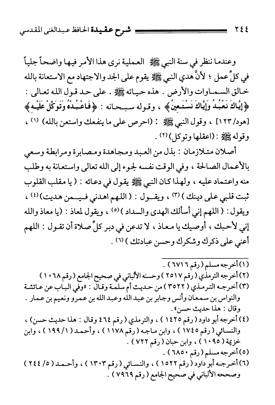 أصلان متلازمان: بذل من العبد ومجاهدة ومصابرة ومرابطة وسعي بالأعمال الصالحة، وفي الوقت نفسه لجوء إلى الله تعالى واستعانة به وطلب منه واعتماد عليه، ولهذا كان النبي صلى الله عليه وسلم يقول في دعائه:""يا مقلب القلوب ثبت قلبي على دينك " 4، ويقول:""اللهم اهدني فيمن هديت " 5، ويقول:""اللهم إني أسألك الهدى والسداد " 6، ويقول لمعاذ:""يا معاذ والله إني لأحبك، أوصيك يا معاذ، لا تدعن في دبر كلِّ صلاة أن تقول: اللهم أعني على ذكرك وشكرك وحسن عبادتك " 7.