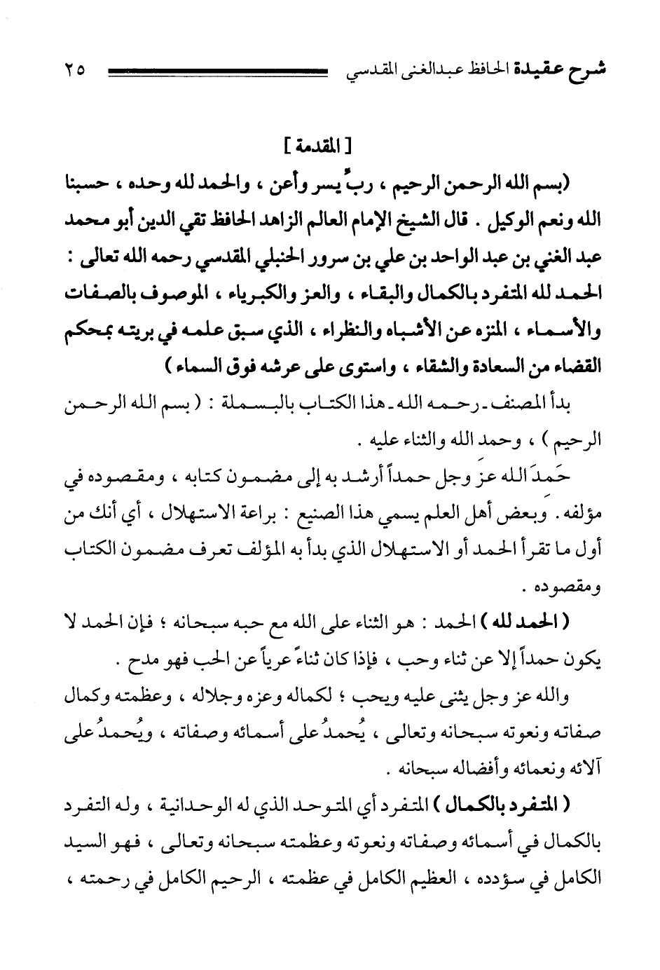 " بسم الله الرحمن الرحيم، ربِّ يسر وأعن، والحمد لله وحده، حسبنا الله ونعم الوكيل. قال الشيخ الإمام العالم الزاهد الحافظ تقي الدين أبو محمد عبد الغني بن عبد الواحد بن علي بن سرور الحنبلي المقدسي رحمه الله تعالى: الحمد لله المتفرد بالكمال والبقاء، والعز والكبرياء، الموصوف بالصفات والأسماء، المنزه عن الأشباه والنظراء، الذي سبق علمه في بريته بمحكم القضاء من السعادة والشقاء، واستوى على عرشه فوق السماء "