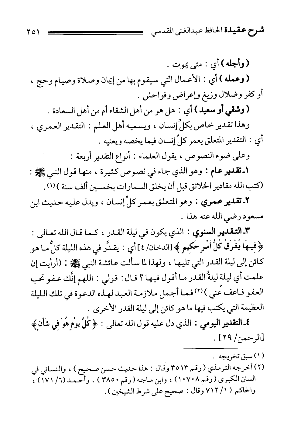3ـ التقدير السنوي: الذي يكون في ليلة القدر، كما قال الله تعالى: {فِيهَا يُفْرَقُ كُلُّ أَمْرٍ حَكِيمٍ} 2 أي: يقدَّر في هذه الليلة كلُّ ما هو كائن إلى ليلة القدر التي تليها، ولهذا لما سألت عائشة النبي صلى الله عليه وسلم:""أرأيت إن علمت أي ليلةٍ ليلةُ القدر ما أقول فيها؟ قال: قولي: اللهم إنَّك عفو تحب العفو فاعف عني " 3 فما أجمل ملازمة العبد لهذه الدعوة في تلك الليلة العظيمة التي يكتب فيها ما هو كائن إلى ليلة القدر الأخرى.