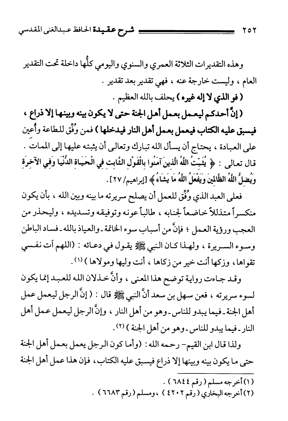 ولذا قال ابن القيم ـ رحمه الله ـ:""وأمَّا كون الرجل يعمل بعمل أهل الجنة حتى ما يكون بينه وبينها إلا ذراع فيسبق عليه الكتاب، فإنَّ هذا عمل أهل الجنة