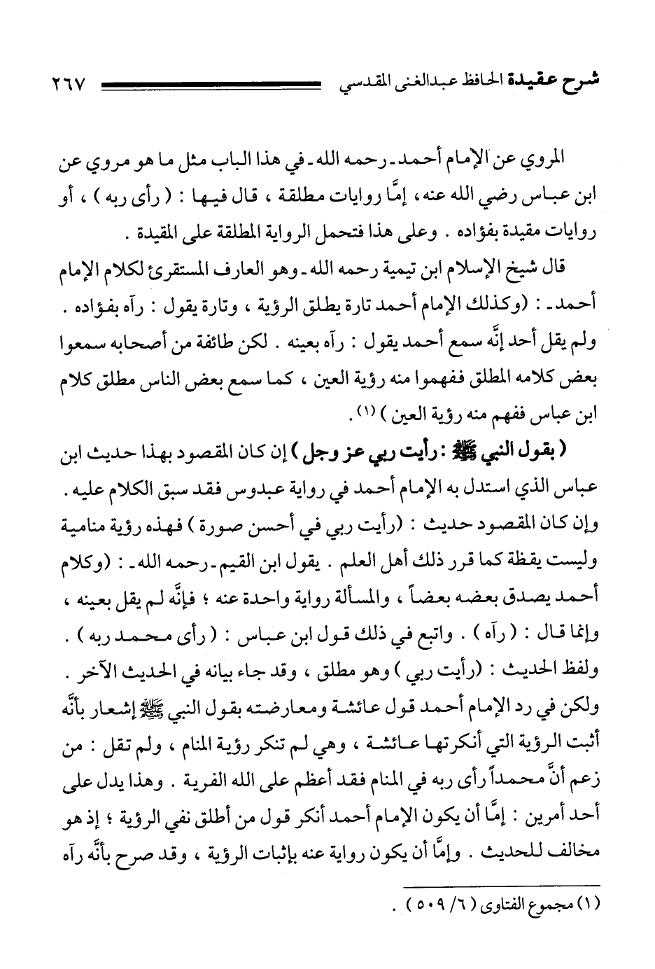قال شيخ الإسلام ابن تيمية رحمه الله ـ وهو العارف المستقرئ لكلام الإمام أحمد ـ:""وكذلك الإمام أحمد تارة يطلق الرؤية، وتارة يقول: رآه بفؤاده. ولم يقل أحد إنَّه سمع أحمد يقول: رآه بعينه. لكن طائفة من أصحابه سمعوا بعض كلامه المطلق ففهموا منه رؤية العين، كما سمع بعض الناس مطلق كلام ابن عباس ففهم منه رؤية العين " 1.