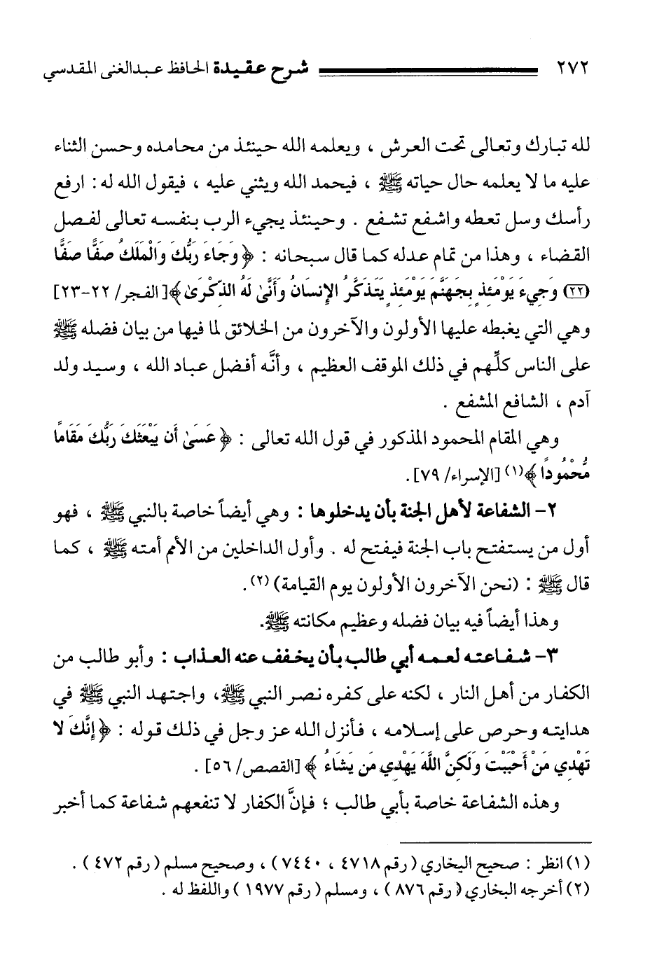 لله تبارك وتعالى تحت العرش، ويعلمه الله حينئذ من محامده وحسن الثناء عليه ما لا يعلمه حال حياته صلى الله عليه وسلم، فيحمد الله ويثني عليه، فيقول الله له: ارفع رأسك وسل تعطه واشفع تشفع. وحينئذ يجيء الرب بنفسه تعالى لفصل القضاء، وهذا من تمام عدله كما قال سبحانه: {وَجَاءَ رَبُّكَ وَالْمَلَكُ صَفّاً صَفّاً وَجِيءَ يَوْمَئِذٍ بِجَهَنَّمَ يَوْمَئِذٍ يَتَذَكَّرُ الأِنْسَانُ وَأَنَّى لَهُ الذِّكْرَى} 1. وهي التي يغبطه عليها الأولون والآخرون من الخلائق لما فيها من بيان فضله صلى الله عليه وسلم على الناس كلِّهم في ذلك الموقف العظيم، وأنَّه أفضل عباد الله، وسيد ولد آدم، الشافع المشفع.
