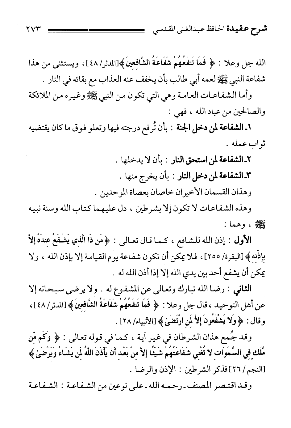 الثاني: رضا الله تبارك وتعالى عن المشفوع له. ولا يرضى سبحانه إلا عن أهل التوحيد،قال جل وعلا: {فَمَا تَنْفَعُهُمْ شَفَاعَةُ الشَّافِعِينَ} 3، وقال: {وَلا يَشْفَعُونَ إِلاَّ لِمَنِ ارْتَضَى} 4.