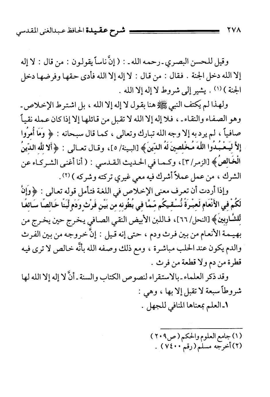 ولهذا لم يَكتف النبي صلى الله عليه وسلم هنا بقول لا إله إلا الله، بل اشترط الإخلاص ـ وهو الصفاء والنقاء ـ، فلا إله إلا الله لا تقبل من قائلها إلا إذا كان عمله نقياً صافياً، لم يرد به إلا وجه الله تبارك وتعالى، كما قال سبحانه: {وَمَا أُمِرُوا إِلاَّ لِيَعْبُدُوا اللَّهَ مُخْلِصِينَ لَهُ الدِّينَ} 2، وقال تعالى: {أَلا لِلَّهِ الدِّينُ الْخَالِصُ} 3، وكما في الحديث القدسي:""أنا أغنى الشركاء عن الشرك، من عمل عملاً أشرك فيه معي غيري تركته وشركه " 4.