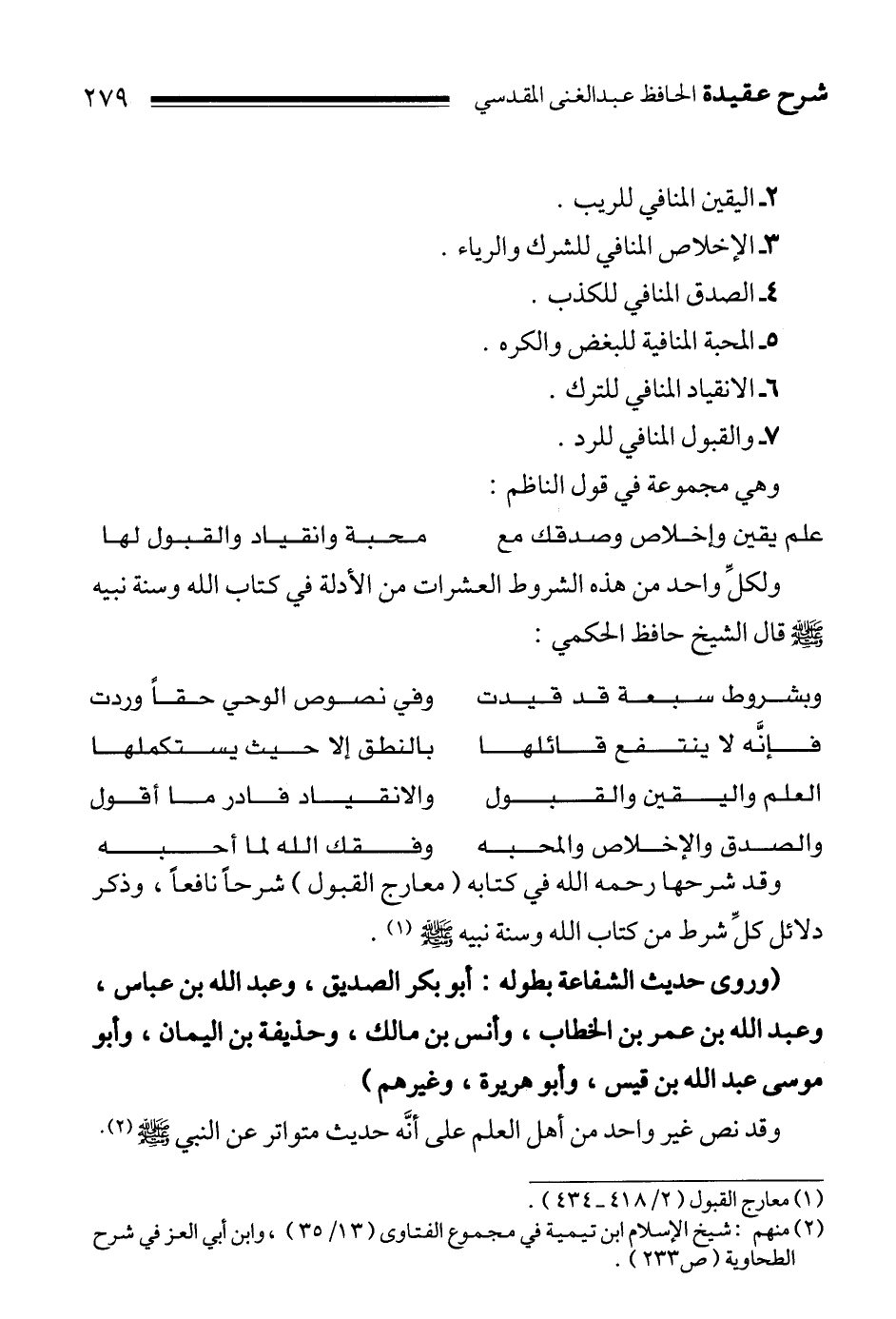 وقد شرحها رحمه الله في كتابه " معارج القبول " شرحاً نافعاً، وذكر دلائل كلِّ شرط من كتاب الله وسنة نبيه صلى الله عليه وسلم 1.