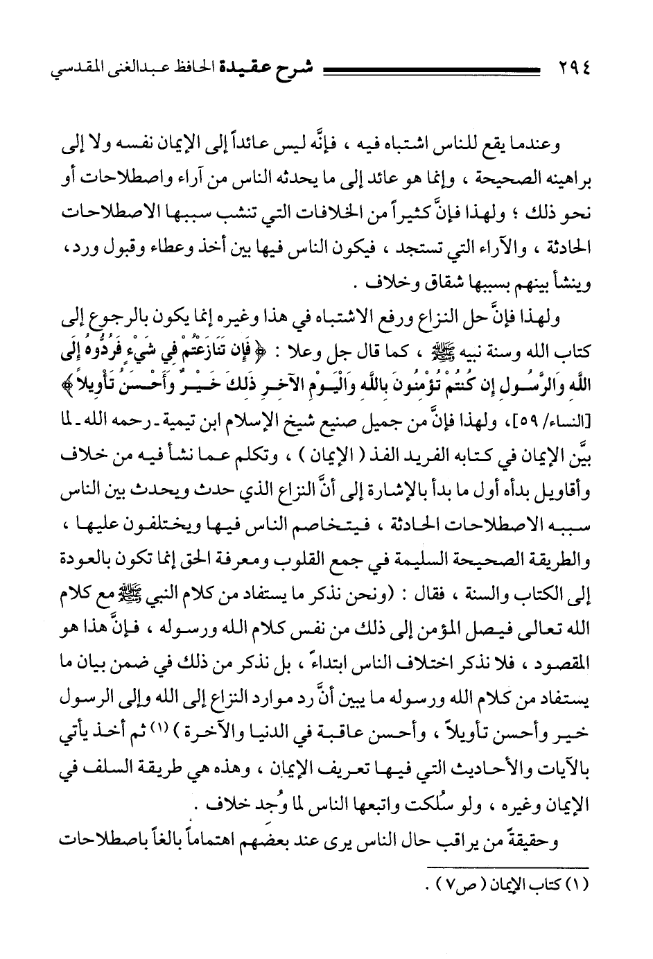 ولهذا فإنَّ حل النزاع ورفع الاشتباه في هذا وغيره إنما يكون بالرجوع إلى كتاب الله وسنة نبيه صلى الله عليه وسلم، كما قال جل وعلا: {فَإِنْ تَنَازَعْتُمْ فِي شَيْءٍ فَرُدُّوهُ إِلَى اللَّهِ وَالرَّسُولِ إِنْ كُنْتُمْ تُؤْمِنُونَ بِاللَّهِ وَالْيَوْمِ الْآخِرِ ذَلِكَ خَيْرٌ وَأَحْسَنُ تَأْوِيلاً} 1، ولهذا فإنَّ من جميل صنيع شيخ الإسلام ابن تيمية ـ رحمه الله ـ لما بيَّن الإيمان في كتابه الفريد الفذ " الإيمان "، وتكلم عما نشأ فيه من خلاف وأقاويل بدأه أول ما بدأ بالإشارة إلى أنَّ النزاع الذي حدث ويحدث بين الناس سببه الاصطلاحات الحادثة، فيتخاصم الناس فيها ويختلفون عليها، والطريقة الصحيحة السليمة في جمع القلوب ومعرفة الحق إنما تكون بالعودة إلى الكتاب والسنة، فقال:""ونحن نذكر ما يستفاد من كلام النبي صلى الله عليه وسلم مع كلام الله تعالى فيصل المؤمن إلى ذلك من نفس كلام الله ورسوله، فإنَّ هذا هو المقصود، فلا نذكر اختلاف الناس ابتداءً، بل نذكر من ذلك في ضمن بيان ما يستفاد من كلام الله ورسوله ما يبين أنَّ رد موارد النزاع إلى الله وإلى الرسول خير وأحسن تأويلاً، وأحسن عاقبة في الدنيا والآخرة " 2 ثم أخذ يأتي بالآيات والأحاديث التي فيها تعريف الإيمان، وهذه هي طريقة السلف في الإيمان وغيره، ولو سُلكت واتبعها الناس لما وُجِد خلاف.