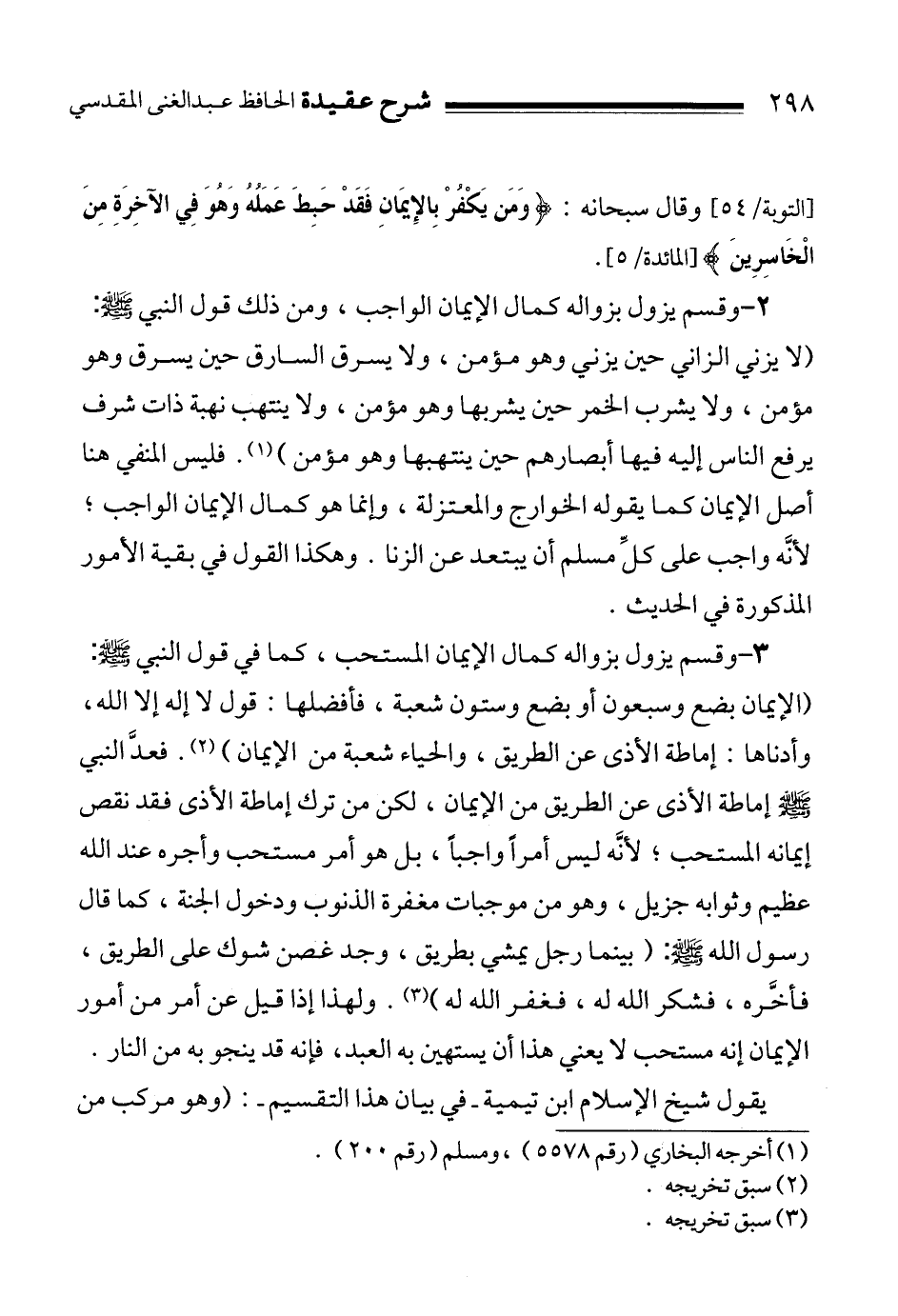 3ـ وقسم يزول بزواله كمال الإيمان المستحب، كما في قول النبي صلى الله عليه وسلم:"" الإيمان بضع وسبعون أو بضع وستون شعبة، فأفضلها: قول لا إله إلا الله، وأدناها: إماطة الأذى عن الطريق، والحياء شعبة من"الإيمان " 3. فعدَّ النبي صلى الله عليه وسلم إماطة الأذى عن الطريق من الإيمان، لكن من ترك إماطة الأذى فقد نقص إيمانه المستحب؛ لأنَّه ليس أمراً واجباً، بل هو أمر مستحب وأجره عند الله عظيم وثوابه جزيل، وهو من موجبات مغفرة الذنوب ودخول الجنة، كما قال رسول الله صلى الله عليه وسلم: ""بينما رجل يمشي بطريق، وجد غصن شوك على الطريق، فأخَّره، فشكر الله له، فغفر الله له " 4. ولهذا إذا قيل عن أمر من أمور الإيمان إنه مستحب لا يعني هذا أن يستهين به العبد، فإنه قد ينجو به من النار.