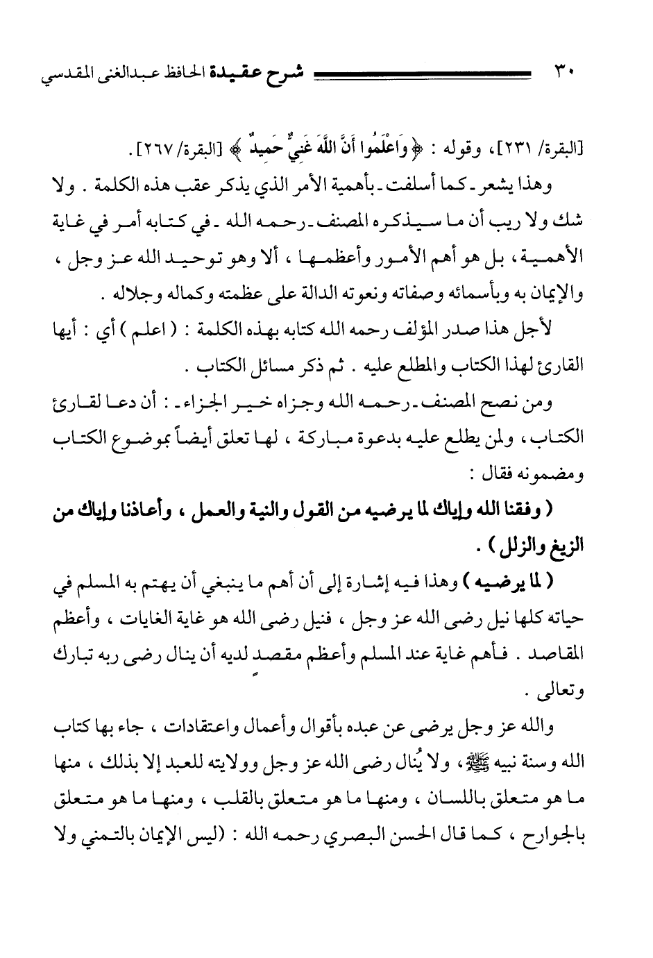 وقوله: {وَاعْلَمُوا أَنَّ اللَّهَ غَنِيٌّ حَمِيدٌ} 1. وهذا يشعر ـ كما أسلفت ـ بأهمية الأمر الذي يذكر عقب هذه الكلمة. ولا شك ولا ريب أن ما سيذكره المصنف ـ رحمه الله"ـ في كتابه أمر في غاية الأهمية، بل هو أهم الأمور وأعظمها، ألا وهو توحيد الله عز وجل، والإيمان به وبأسمائه وصفاته ونعوته الدالة على عظمته وكماله وجلاله.