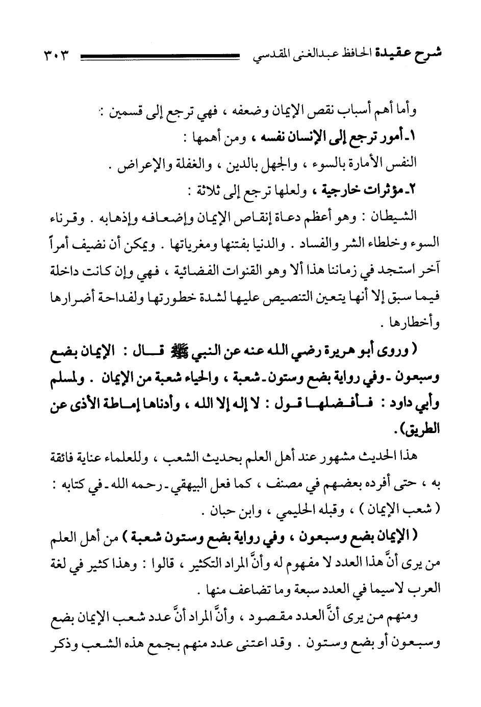 " وروى أبو هريرة رضي الله عنه عن النبي صلى الله عليه وسلم قال:""الإيمان بضع وسبعون، ـ وفي رواية بضع وستون ـ شعبة، والحياء شعبة من الإيمان ". ولمسلم وأبي داود:""فأفضلها قول: لا إله إلا الله، وأدناها إماطة الأذى عن الطريق " "
