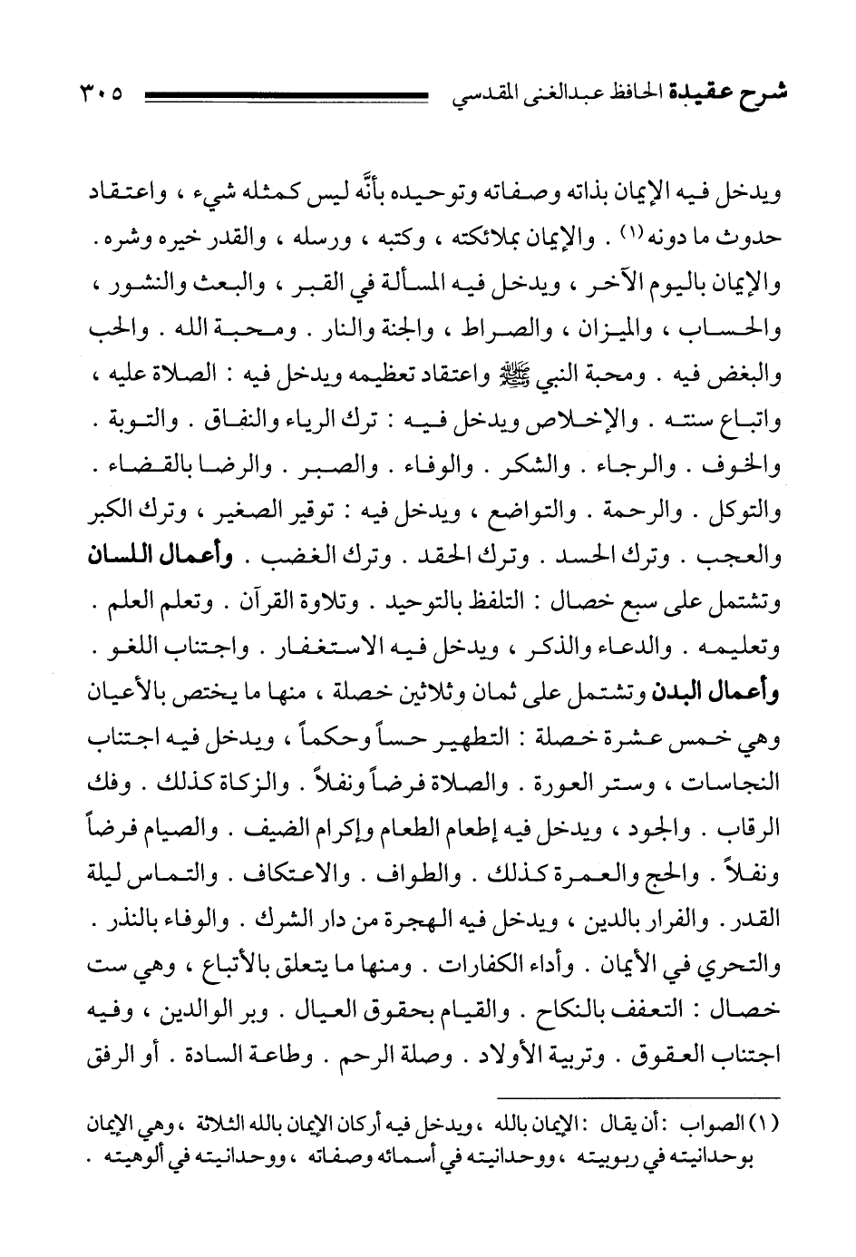 ويدخل فيه الإيمان بذاته وصفاته وتوحيده بأنَّه ليس كمثله شيء، واعتقاد حدوث ما دونه 1. والإيمان بملائكته، وكتبه، ورسله، والقدر خيره وشره. والإيمان باليوم الآخر، ويدخل فيه المسألة في القبر، والبعث والنشور، والحساب، والميزان، والصراط، والجنة والنار. ومحبة الله. والحب والبغض فيه. ومحبة النبي صلى الله عليه وسلم واعتقاد تعظيمه ويدخل فيه: الصلاة عليه، واتباع سنته. والإخلاص ويدخل فيه: ترك الرياء والنفاق. والتوبة. والخوف. والرجاء. والشكر. والوفاء. والصبر. والرضا بالقضاء. والتوكل. والرحمة. والتواضع، ويدخل فيه: توقير الصغير، وترك الكبر والعجب. وترك الحسد. وترك الحقد. وترك الغضب. وأعمال اللسان وتشتمل على سبع خصال: التلفظ بالتوحيد. وتلاوة القرآن. وتعلم العلم. وتعليمه. والدعاء والذكر، ويدخل فيه الاستغفار. واجتناب اللغو. وأعمال البدن وتشتمل على ثمان وثلاثين خصلة، منها ما يختص بالأعيان وهي خمس عشرة خصلة: التطهير حساً وحكماً، ويدخل فيه اجتناب النجاسات، وستر العورة. والصلاة فرضاً ونفلاً. والزكاة كذلك. وفك الرقاب. والجود، ويدخل فيه إطعام الطعام وإكرام الضيف. والصيام فرضاً ونفلاً. والحج والعمرة كذلك. والطواف. والاعتكاف. والتماس ليلة القدر. والفرار بالدين، ويدخل فيه الهجرة من دار الشرك. والوفاء بالنذر. والتحري في الأيمان. وأداء الكفارات. ومنها ما يتعلق بالأتباع، وهي ست خصال: التعفف بالنكاح. والقيام بحقوق العيال. وبر الوالدين، وفيه اجتناب العقوق. وتربية الأولاد. وصلة الرحم. وطاعة السادة. أو الرفق