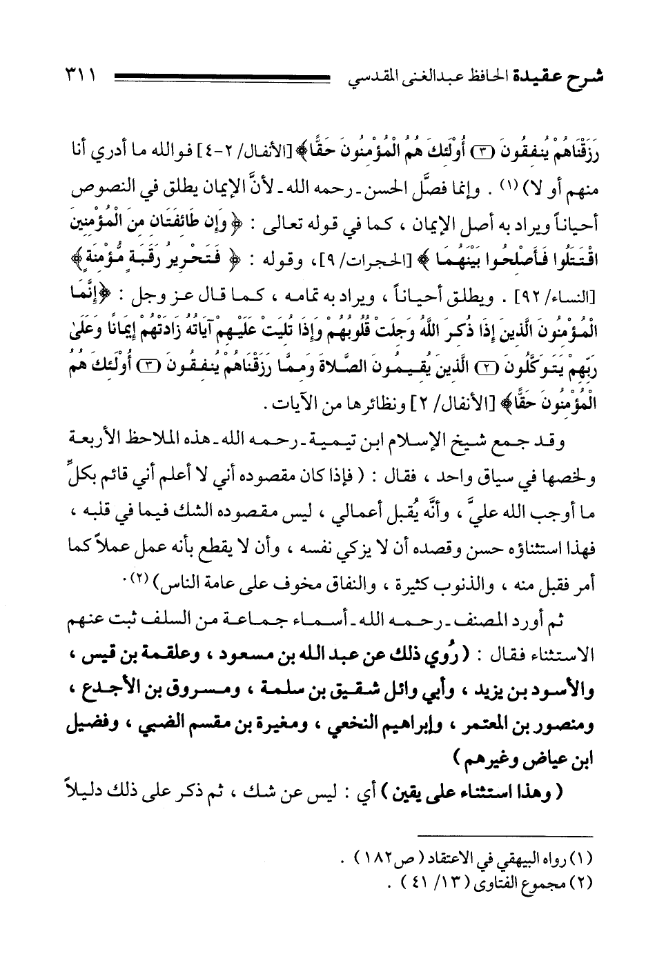 رَزَقْنَاهُمْ يُنْفِقُونَ أُولَئِكَ هُمُ الْمُؤْمِنُونَ حَقّاً} 1 فوالله ما أدري أنا منهم أو لا"" 2. وإنما فصَّل الحسن ـ رحمه الله ـ لأنَّ الإيمان يطلق في النصوص أحياناً ويراد به أصل الإيمان، كما في قوله تعالى: {وَإِنْ طَائِفَتَانِ مِنَ الْمُؤْمِنِينَ اقْتَتَلُوا فَأَصْلِحُوا بَيْنَهُمَا} 3، وقوله: {فَتَحْرِيرُ رَقَبَةٍ مُؤْمِنَةٍ} 4. ويطلق أحياناً، ويراد به تمامه، كما قال عز وجل: {إِنَّمَا الْمُؤْمِنُونَ الَّذِينَ إِذَا ذُكِرَ اللَّهُ وَجِلَتْ قُلُوبُهُمْ وَإِذَا تُلِيَتْ عَلَيْهِمْ آيَاتُهُ زَادَتْهُمْ إِيمَاناً وَعَلَى رَبِّهِمْ يَتَوَكَّلُونَ الَّذِينَ يُقِيمُونَ الصَّلاةَ وَمِمَّا رَزَقْنَاهُمْ يُنْفِقُونَ أُولَئِكَ هُمُ الْمُؤْمِنُونَ حَقّاً} ونظائرها من الآيات.