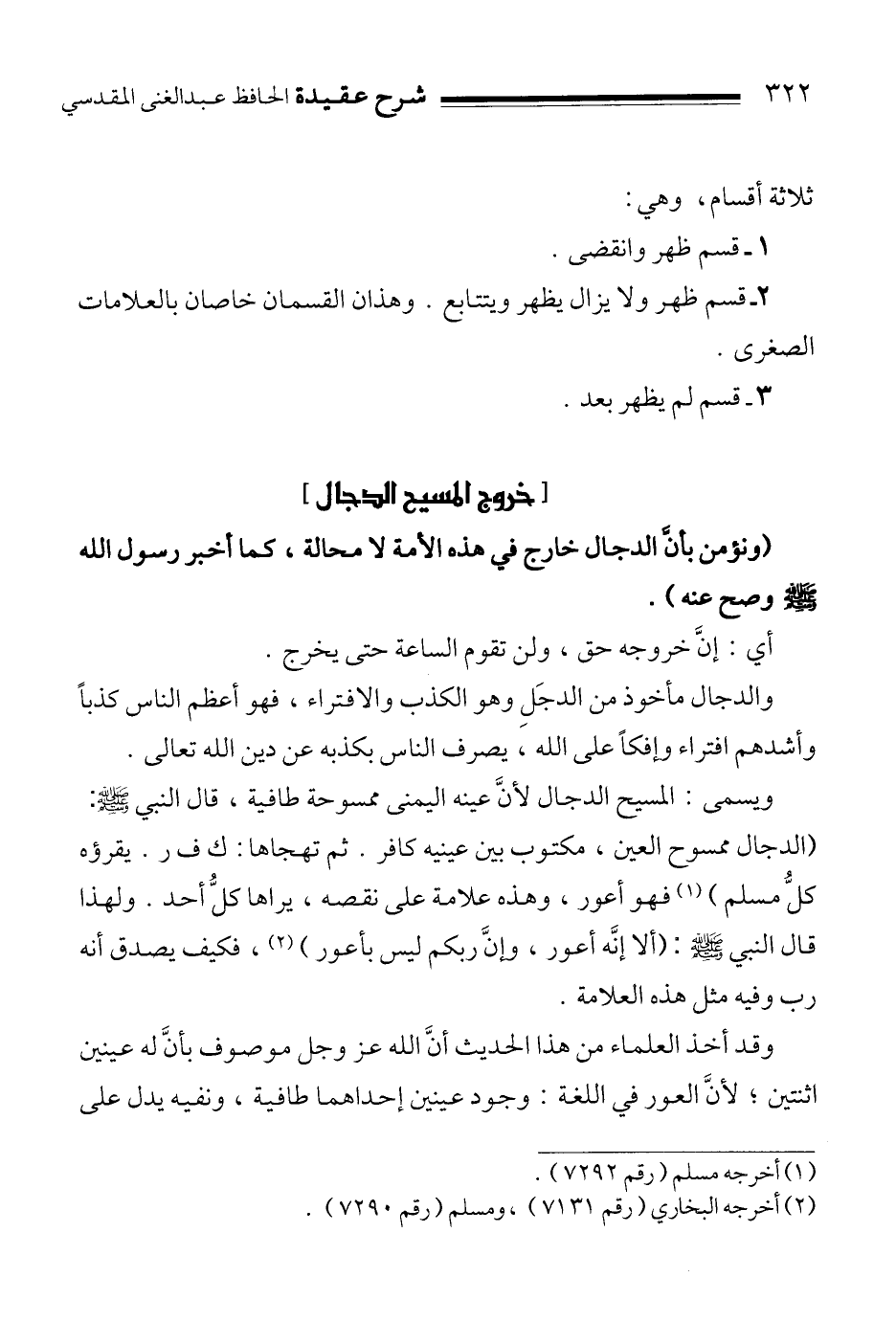 " ونؤمن بأنَّ الدجال خارج في هذه الأمة لا محالة، كما أخبر رسول الله صلى الله عليه وسلم وصح عنه "