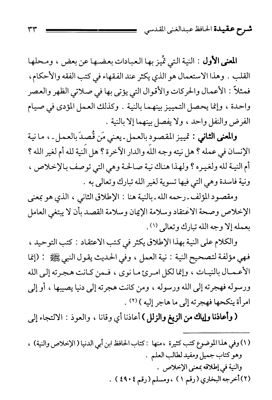 والكلام على النية بهذا الإطلاق يكثر في كتب الاعتقاد: كتب التوحيد، فهي مؤلفة لتصحيح النية: نية العمل، وفي الحديث يقول النبي صلى الله عليه وسلم: " إنما الأعمال بالنيات، وإنما لكل امرئ ما نوى، فمن كانت هجرته إلى الله ورسوله فهجرته إلى الله ورسوله، ومن كانت هجرته إلى دنيا يصيبها، أو إلى امرأة ينكحها فهجرته إلى ما هاجر إليه " 2