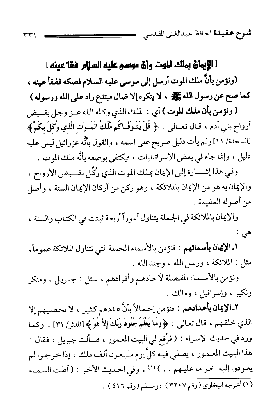 " ونؤمن بأنَّ ملك الموت أرسل إلى موسى عليه السلام فصكه ففقأ عينه، كما صح عن رسول الله صلى الله عليه وسلم، لا ينكره إلا ضال مبتدع راد على الله ورسوله "