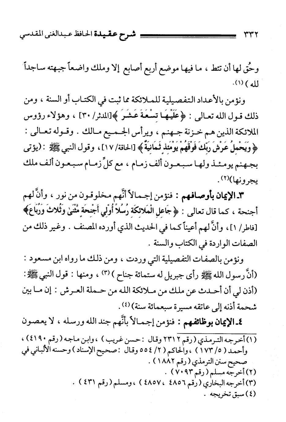 3ـ الإيمان بأوصافهم: فنؤمن إجمالاً أنَّهم مخلوقون من نور، وأنَّ لهم أجنحة، كما قال تعالى: {جَاعِلِ الْمَلائِكَةِ رُسُلاً أُولِي أَجْنِحَةٍ مَثْنَى وَثُلاثَ وَرُبَاعَ} 5، وأنَّ لهم أعيناً كما في الحديث الذي أورده المصنف. وغير ذلك من الصفات الواردة في الكتاب والسنة.