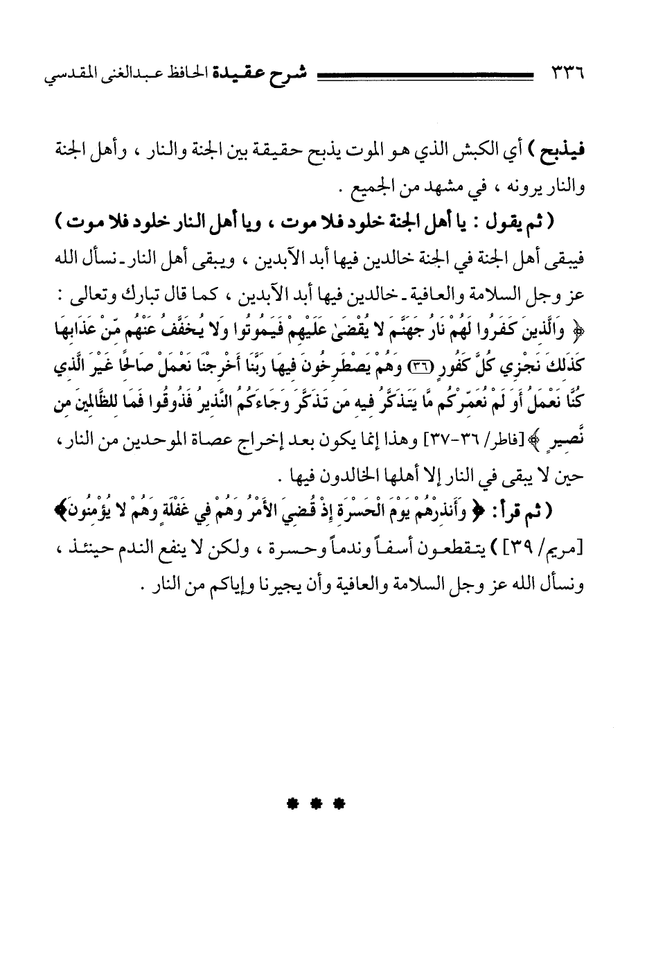 " ثم يقول: يا أهل الجنة خلود فلا موت، ويا أهل النار خلود فلا موت " فيبقى أهل الجنة في الجنة خالدين فيها أبد الآبدين، ويبقى أهل النار ـ نسأل الله عز وجل السلامة والعافية ـ خالدين فيها أبد الآبدين، كما قال تبارك وتعالى: {وَالَّذِينَ كَفَرُوا لَهُمْ نَارُ جَهَنَّمَ لا يُقْضَى عَلَيْهِمْ فَيَمُوتُوا وَلا يُخَفَّفُ عَنْهُمْ مِنْ عَذَابِهَا كَذَلِكَ نَجْزِي كُلَّ كَفُورٍ وَهُمْ يَصْطَرِخُونَ فِيهَا رَبَّنَا أَخْرِجْنَا نَعْمَلْ صَالِحاً غَيْرَ الَّذِي كُنَّا نَعْمَلُ أَوَلَمْ نُعَمِّرْكُمْ مَا يَتَذَكَّرُ فِيهِ مَنْ تَذَكَّرَ وَجَاءَكُمُ النَّذِيرُ فَذُوقُوا فَمَا لِلظَّالِمِينَ مِنْ نَصِيرٍ} 1. وهذا إنما يكون بعد إخراج عصاة الموحدين من النار، حين لا يبقى في النار إلا أهلها الخالدون فيها.