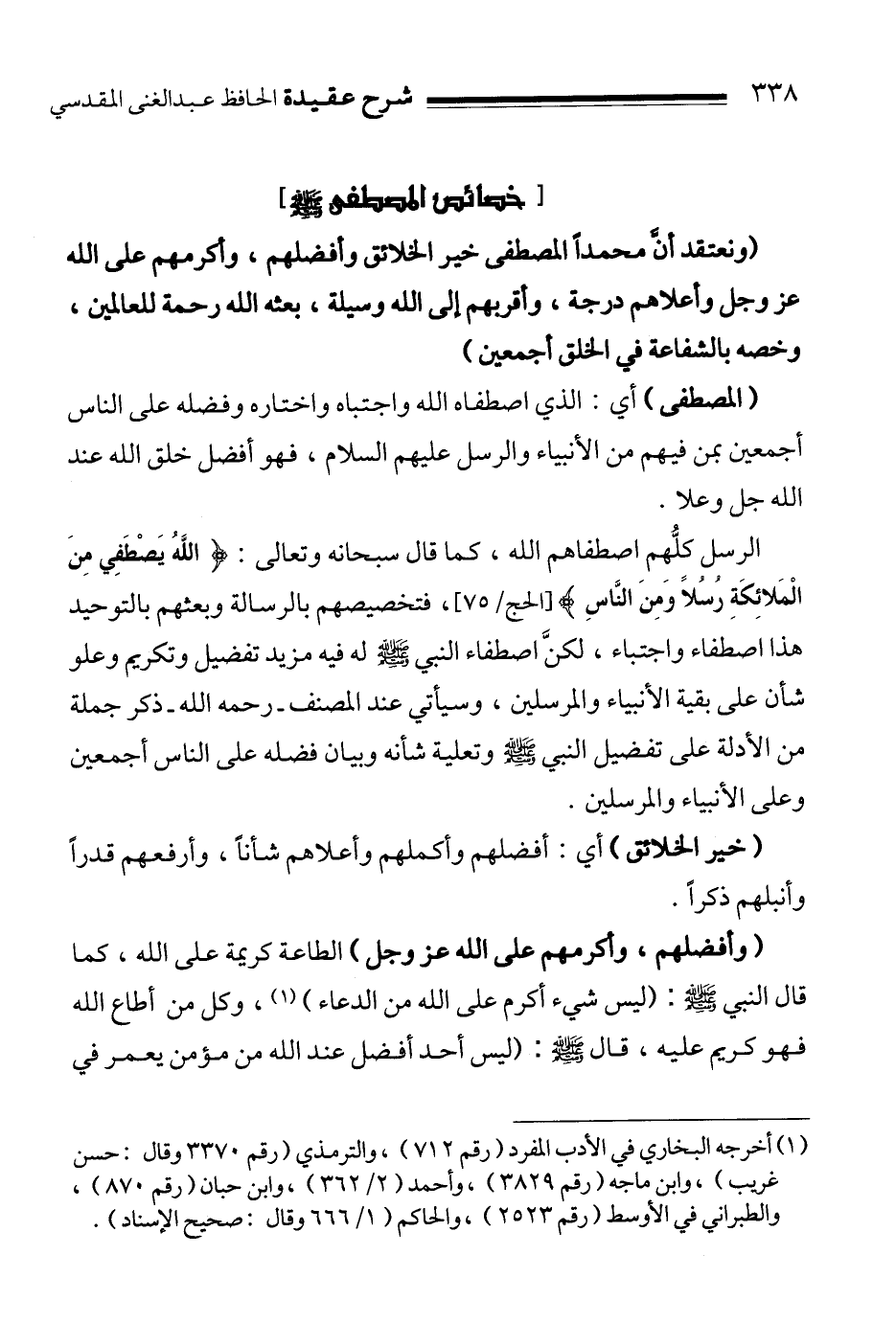 " ونعتقد أنَّ محمداً المصطفى خير الخلائق وأفضلهم، وأكرمهم على الله عز وجل وأعلاهم درجة، وأقربهم إلى الله وسيلة، بعثه الله رحمة للعالمين، وخصه بالشفاعة في الخلق أجمعين "