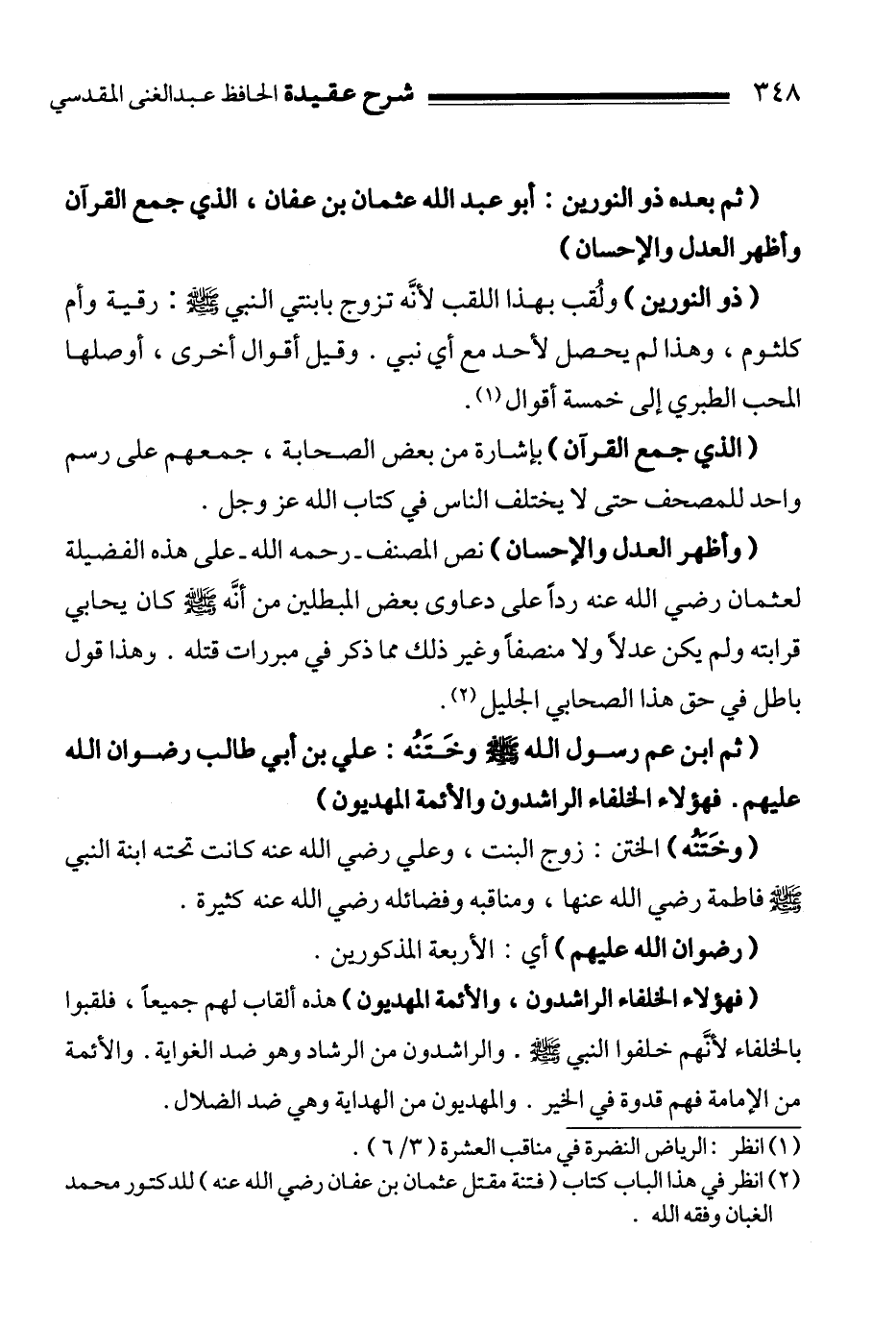 " ثم بعده ذو النورين: أبو عبد الله عثمان بن عفان، الذي جمع القرآن وأظهر العدل والإحسان "