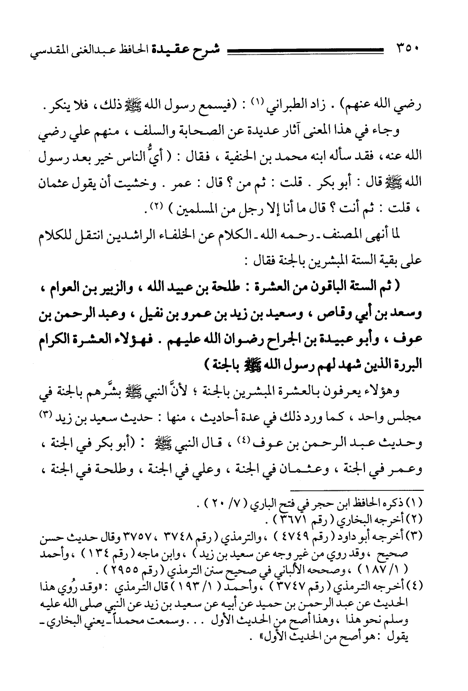 وهؤلاء يعرفون بالعشرة المبشرين بالجنة؛ لأنَّ النبي صلى الله عليه وسلم بشَّرهم بالجنة في مجلس واحد، كما ورد ذلك في عدة أحاديث، منها: حديث سعيد بن زيد 3، وحديث عبد الرحمن بن عوف 4، قال النبي صلى الله عليه وسلم:""أبو بكر في الجنة، وعمر في الجنة، وعثمان في الجنة، وعلي في الجنة، وطلحة في الجنة،