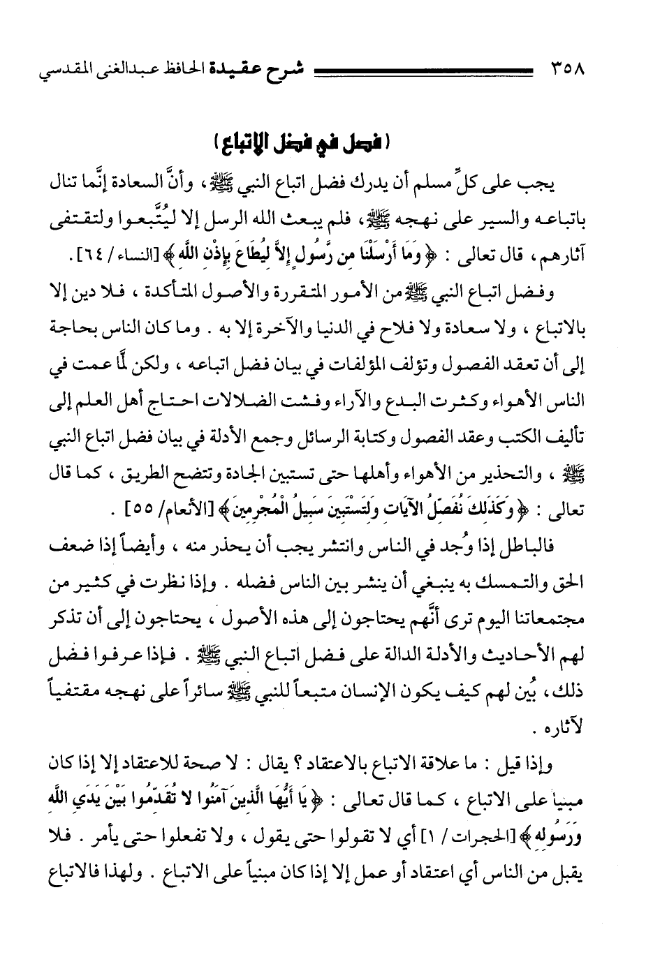 وإذا قيل: ما علاقة الاتباع بالاعتقاد؟ يقال: لا صحة للاعتقاد إلا إذا كان مبنياً على الاتباع، كما قال تعالى: {يَا أَيُّهَا الَّذِينَ آمَنُوا لا تُقَدِّمُوا بَيْنَ يَدَيِ اللَّهِ وَرَسُولِهِ} 3 أي لا تقولوا حتى يقول، ولا تفعلوا حتى يأمر. فلا يقبل من الناس أي اعتقاد أو عمل إلا إذا كان مبنياً على الاتباع. ولهذا فالاتباع