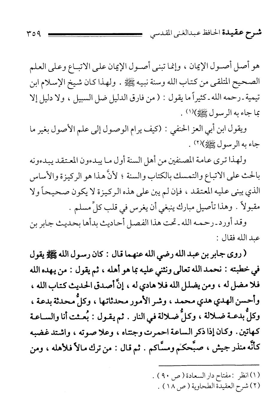 " روى جابر بن عبد الله رضي الله عنهما قال:""كان رسول الله صلى الله عليه وسلم يقول في خطبته: نحمد الله تعالى ونثني عليه بما هو أهله، ثم يقول: من يهده الله فلا مضل له، ومن يضلل الله فلا هادي له، إنَّ أصدق الحديث كتاب الله، وأحسن الهدي هدي محمد، وشر الأمور محدثاتها، وكلُّ محدثة بدعة، وكلُّ بدعة ضلالة، وكلُّ ضلالة في النار. ثم يقول: بُعثت أنا والساعة كهاتين. وكان إذا ذكر الساعة احمرت وجنتاه، وعلا صوته، واشتد غضبه كأنَّه منذر جيش، صبَّحكم ومسَّاكم. ثم قال: من ترك مالاً فلأهله، ومن