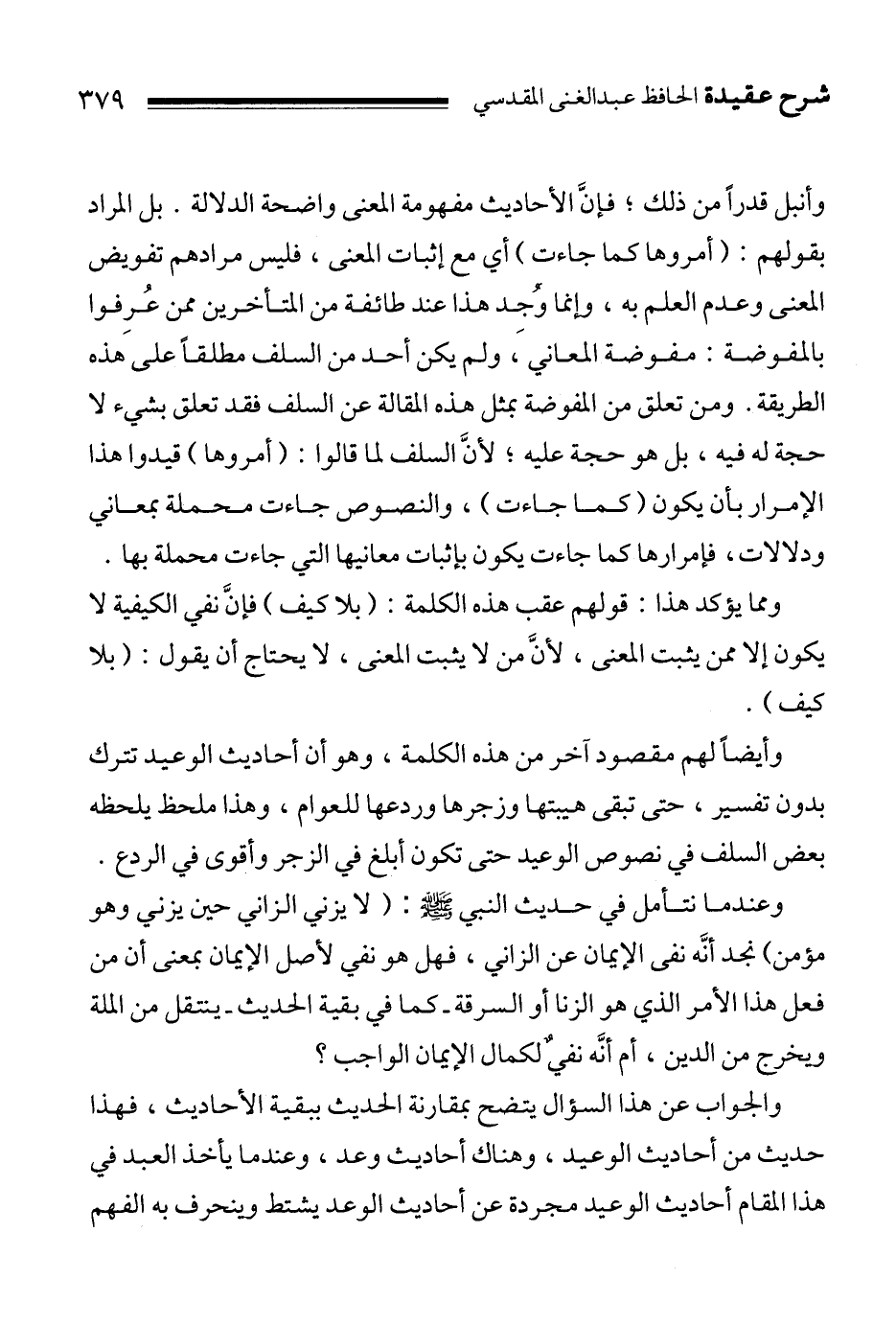 وأنبل قدراً من ذلك؛ فإنَّ الأحاديث مفهومة المعنى واضحة الدلالة. بل المراد بقولهم: " أمروها كما جاءت " أي مع إثبات المعنى، فليس مرادهم تفويض المعنى وعدم العلم به، وإنما وُجِد هذا عند طائفة من المتأخرين ممن عُرِفوا بالمفوضة: مفوضة المعاني، ولم يكن أحد من السلف مطلقاً على هذه الطريقة. ومن تعلق من المفوضة بمثل هذه المقالة عن السلف فقد تعلق بشيء لا حجة له فيه، بل هو حجة عليه؛ لأنَّ السلف لما قالوا: " أمروها " قيدوا هذا الإمرار بأن يكون " كما جاءت "، والنصوص جاءت محملة بمعاني ودلالات، فإمرارها كما جاءت يكون بإثبات معانيها التي جاءت محملة بها.