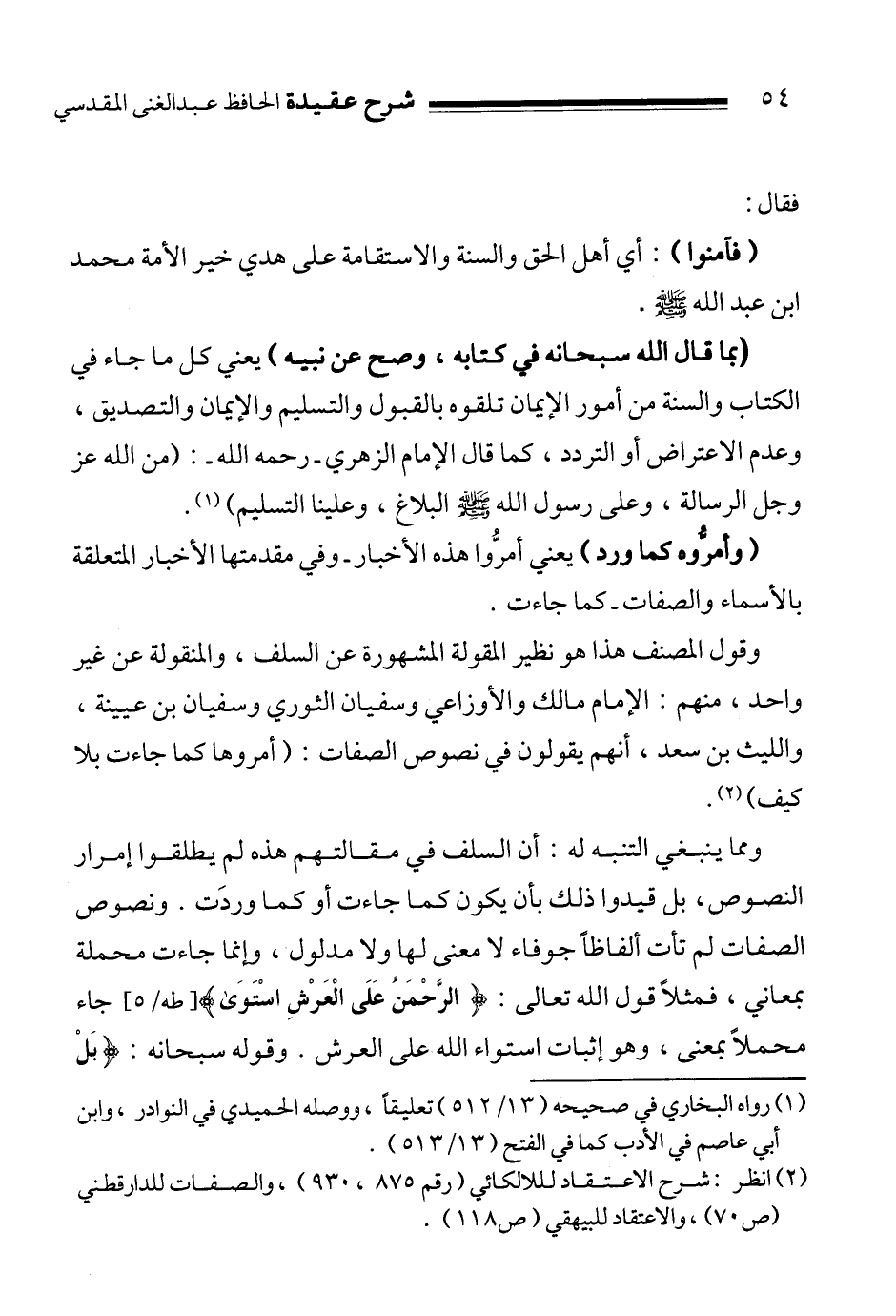 . وأمرُّوه كما ورد"يعني أمرُّوا هذه الأخبار ـ وفي مقدمتها الأخبار المتعلقة بالأسماء والصفات ـ كما جاءت.