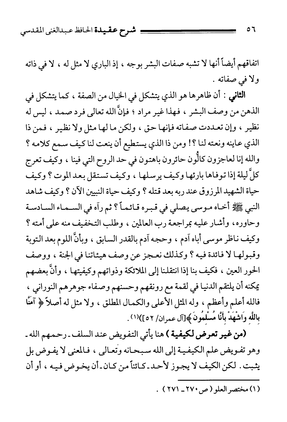 الثاني: أن ظاهرها هو الذي يتشكل في الخيال من الصفة، كما يتشكل في الذهن من وصف البشر، فهذا غير مراد؛ فإنَّ الله تعالى فرد صمد، ليس له نظير، وإن تعددت صفاته فإنها حق، ولكن ما لها مثل ولا نظير، فمن ذا الذي عاينه ونعته لنا؟! ومن ذا الذي يستطيع أن ينعت لنا كيف سمع كلامه؟ والله إنا لعاجزون كالُّون حائرون باهتون في حد الروح التي فينا، وكيف تعرج كلَّ ليلة إذا توفاها بارئها وكيف يرسلها، وكيف تستقل بعد الموت؟ وكيف حياة الشهيد المرزوق عند ربه بعد قتله؟ وكيف حياة النبيين الآن؟ وكيف شاهد النبي صلى الله عليه وسلم أخاه موسى يصلي في قبره قائماً؟ ثم رآه في السماء السادسة وحاوره، وأشار عليه بمراجعة رب العالمين، وطلب التخفيف منه على أمته؟ وكيف ناظر موسى أباه آدم، وحجه آدم بالقدر السابق، وبأنَّ اللوم بعد التوبة وقبولها لا فائدة فيه؟ وكذلك نعجز عن وصف هيئاتنا في الجنة، ووصف الحور العين، فكيف بنا إذا انتقلنا إلى الملائكة وذواتهم وكيفيتها، وأنَّ بعضهم يمكنه أن يلتقم الدنيا في لقمة مع رونقهم وحسنهم وصفاء جوهرهم النوراني، فالله أعلم وأعظم، وله المثل الأعلى والكمال المطلق، ولا مثل له أصلاً: {آمَنَّا بِاللَّهِ وَاشْهَدْ بِأَنَّا مُسْلِمُونَ} 1 " 2.