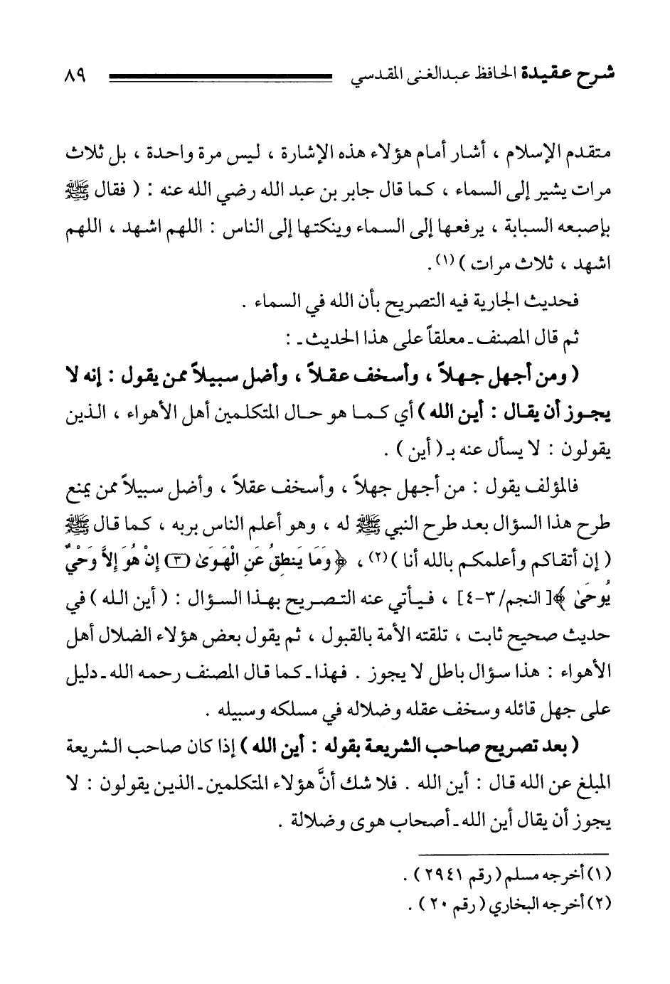 فالمؤلف يقول: من أجهل جهلاً، وأسخف عقلاً، وأضل سبيلاً ممن يمنع طرح هذا السؤال بعد طرح النبي صلى الله عليه وسلم له، وهو أعلم الناس بربه، كما قال صلى الله عليه وسلم: " إن أتقاكم وأعلمكم بالله أنا " 2،: {وَمَا يَنْطِقُ عَنِ الْهَوَى إِنْ هُوَ إِلاَّ وَحْيٌ يُوحَى} 3، فيأتي عنه التصريح بهذا السؤال:"أين الله"في حديث صحيح ثابت، تلقته الأمة بالقبول، ثم يقول بعض هؤلاء الضلال أهل الأهواء: هذا سؤال باطل لا يجوز. فهذا ـ كما قال المصنف رحمه الله ـ دليل على جهل قائله وسخف عقله وضلاله في مسلكه وسبيله.