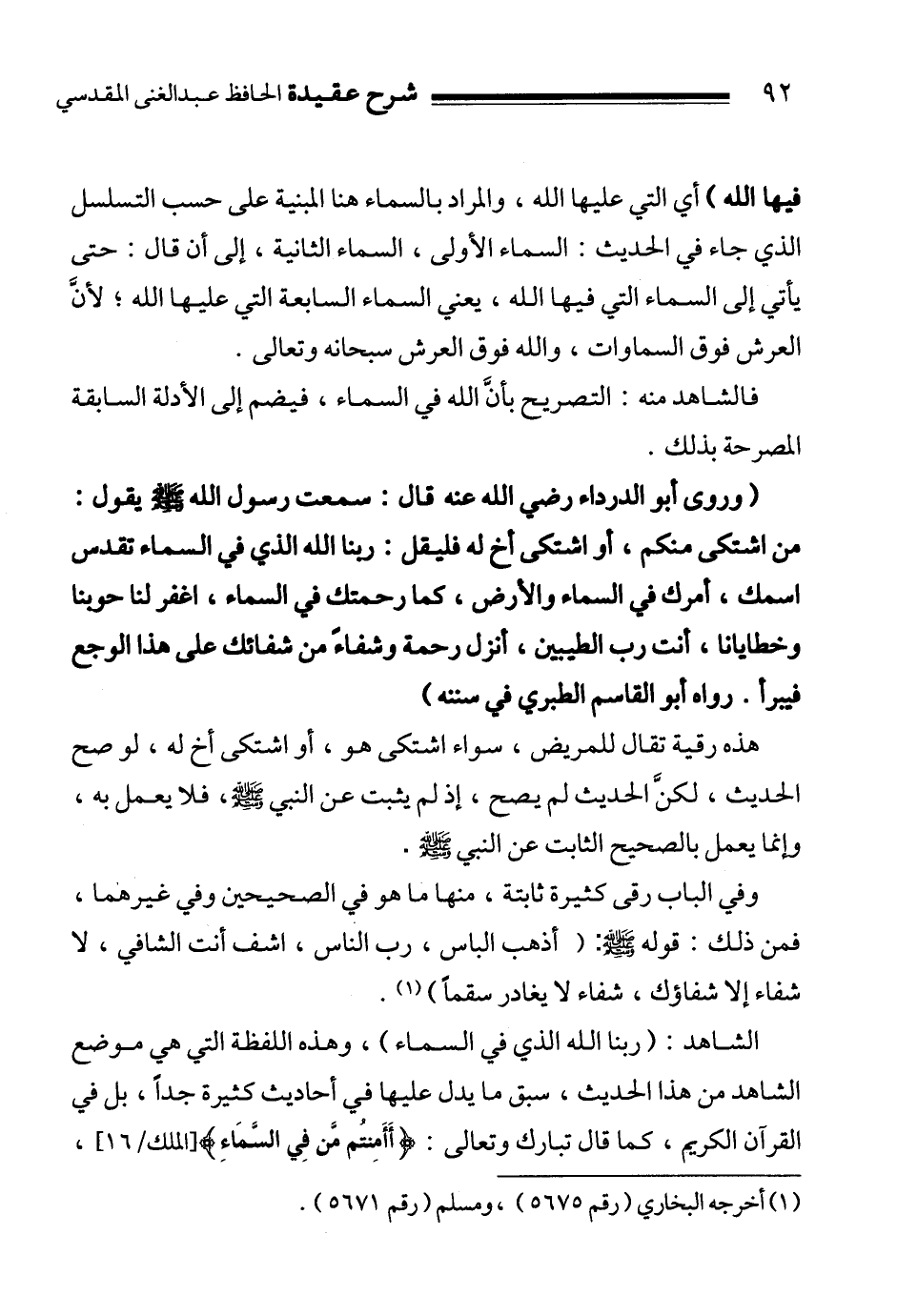 الشاهد:"ربنا الله الذي في السماء"، وهذه اللفظة التي هي موضع الشاهد من هذا الحديث، سبق ما يدل عليها في أحاديث كثيرة جداً، بل في القرآن الكريم، كما قال تبارك وتعالى: {أَأَمِنْتُمْ مَنْ فِي السَّمَاءِ} 2،