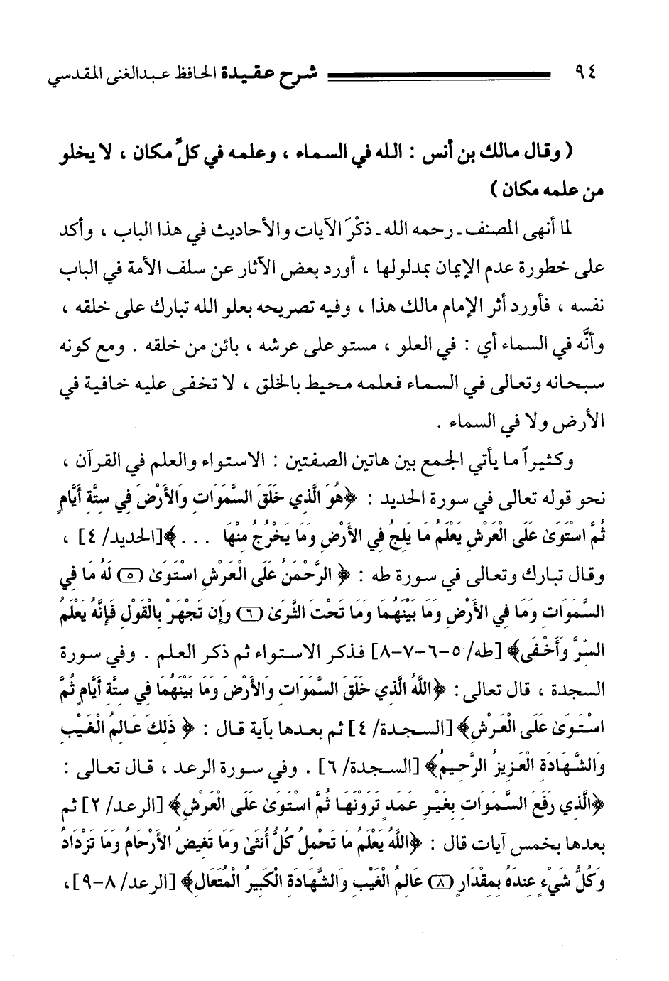" وقال مالك بن أنس: الله في السماء، وعلمه في كلِّ مكان، لا يخلو من علمه مكان"