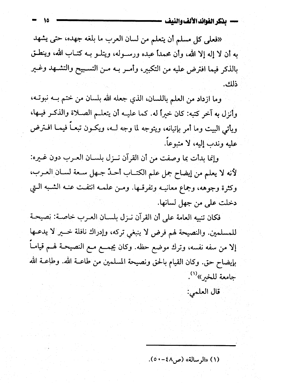 "فعلى كل مسلم أن يتعلم من لسان العرب ما بلغه جهده، حتى يشهد