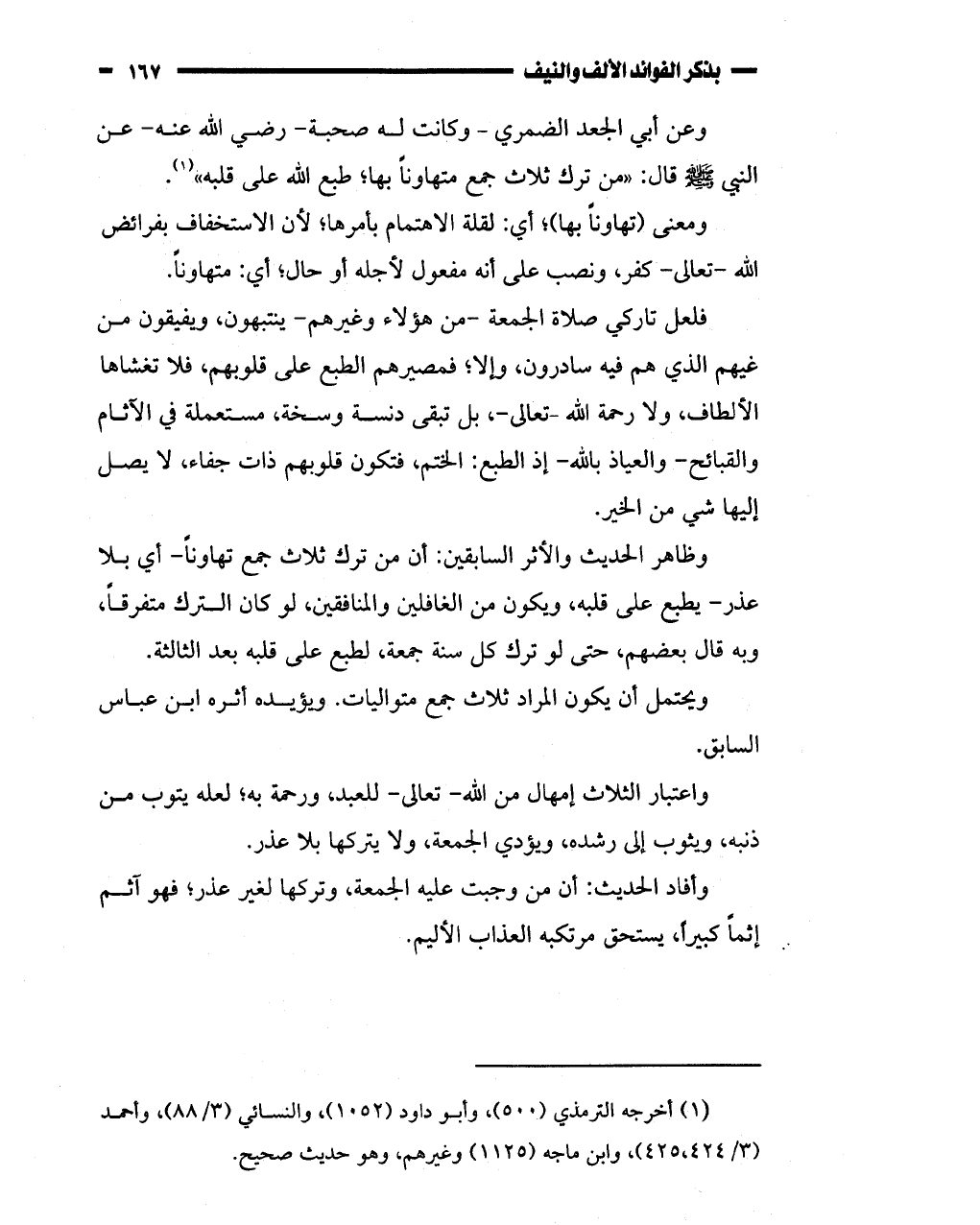 الني! ب! قال: "من ترك ثلاث جمع متهاونأ بها، طبع الله على قلبه " (؟).