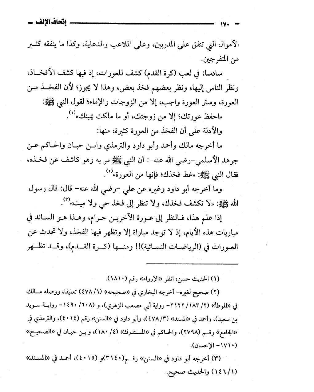 ألله! ع! ر: "لا تكشف فخذك، ولا تنظر إلى فخذ حي ولا ميت" (3).