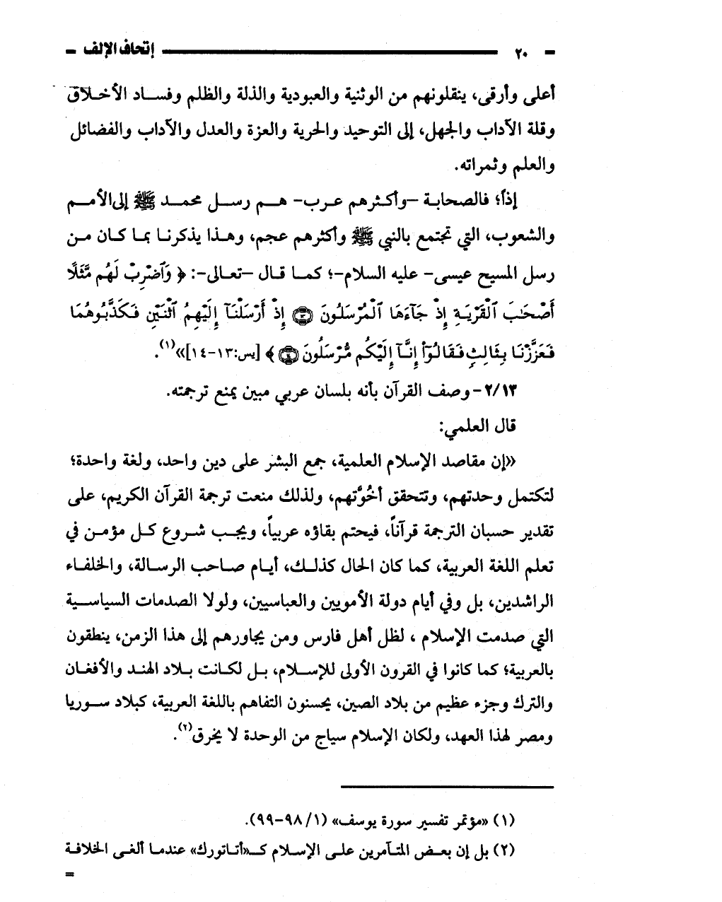 "ان مقاصد الإسلام العلمية، جمع البشز على دين واحد، ولغة واحدة؟