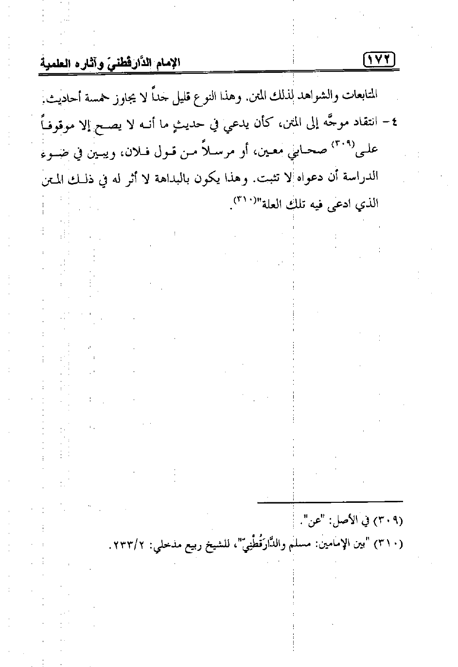 1- انتقاد موجّه إلى أسانيد"1" معينة، فيبدي لها عللا من إرسال، أو انقطاع، أو ضعف راو، أو عدم سماعه، أو مخالفته للثقات في أمرٍ ما. ويتبين في ضوء الدراسة والبحث أنه غير مصيب فيما أبداه من علة. وهذا النوع من الانتقادات لا يكون له تأثير في متون تلك الأسانيد لعدم ثبوت العلل التي أبداها.
