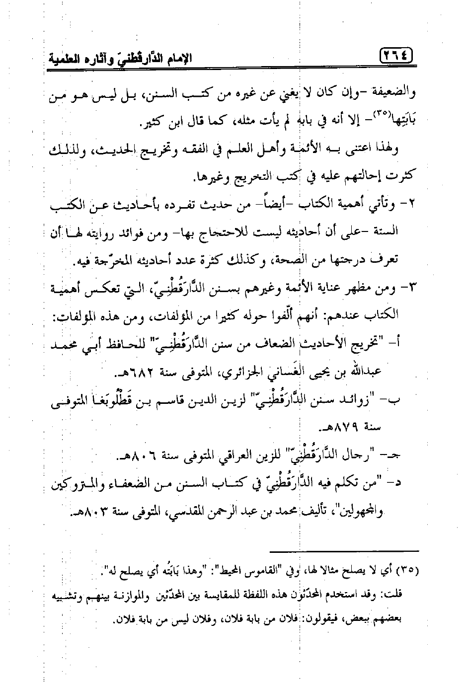 وغاية ما يعزى مثل ذلك إلى كتاب الدَّارَقُطْنِيّ، وهو قصد به غرائب السنن، ولهذا يروي فيه من الضعيف، والموضوع، ما لا يرويه غيره، وقد اتفق أهل العلم بالحديث على أن مجرد العزو إليه لا يبيح الاعتماد عليه ومن كتب من أهل العلم بالحديث فيما يروي في ذلك يبين أنه ليس فيها حديث صحيح"""1".