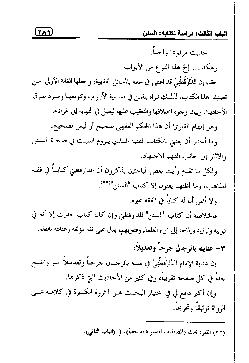 ثانياً: بالنظر إلى نسبة الأحاديث التي أوضح عللها أو أبان ضعفها، في جنب الأحاديث التي حكم بصحتها أو حسنها يتبين أن النوع الأول من الأحاديث هو الأكثر جدا، بحيث أن الإنسان لا يتردد في أن الغرض الأساس من تأليف الكتاب لدى المؤلف هو كشف علل أحاديث الأحكام في أبوابها -وإن خرج عن هذا القصد أحيانا، لسبب أو آخر- كأن يورد أحاديث صحيحة تعارض الحديث الضعيف ليبين ضعفه"1". وإلا فما الذي يلجئ الدَّارَقُطْنِيّ رحمه الله تعالى -وهو الإمام الحافظ- إلى إيراد هذا النوع من الحديث -أي الأحاديث الضعيفة والواهية الساقطة- والعدول عن الأحاديث الصحيحة في كل باب تحت عنوان "السنن"؟ رغم أنه كان ذلك الرجل الذي انبري لنقد أحاديث صحيح