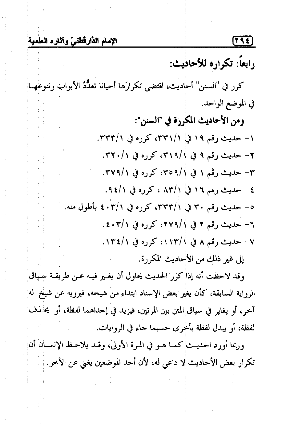 هـ- المثال الخامس: "باب الوضوء بفضل السواك" 1/39، ذكر فيه أثرين عن جرير "هو ابن حازم"، وذكر فيه أيضاً حديثين مرفوعين والأبواب التي يورد فيها الدَّارَقُطْنِيّ الآثار إلى جنب الأحاديث المرفوعة كثيرة جدا في السنن تمثل أغلبية الأبواب.