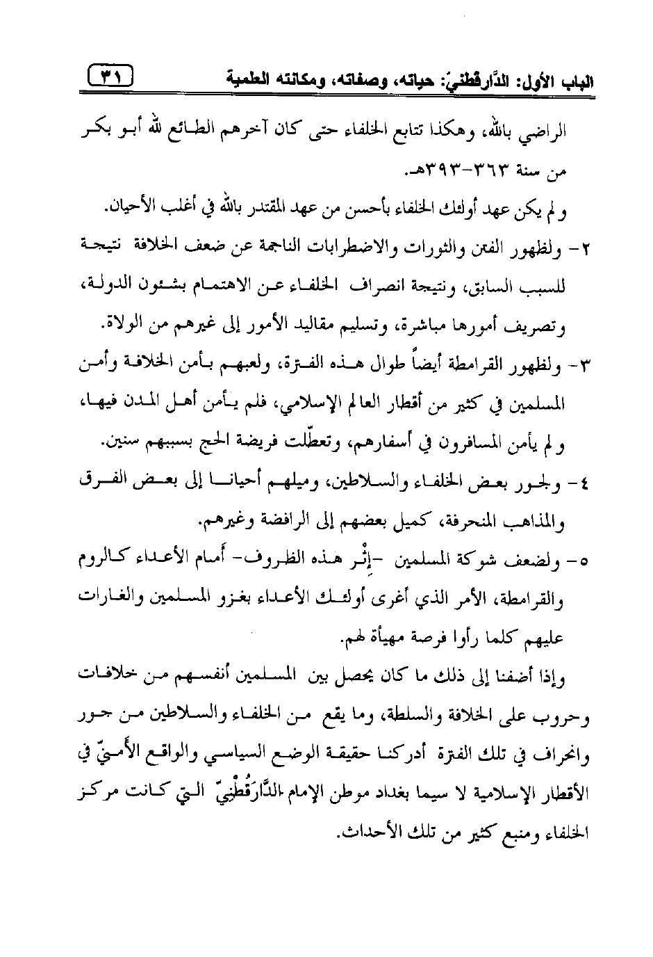 وإذا أضفنا إلى ذلك ما كان يحصل بين المسلمين أنفسهم من خلافات وحروب على الخلافة والسلطة، وما يقع من الخلفاء والسلاطين من جور وانحراف في تلك الفترة أدركنا حقيقة الوضع السياسي والواقع الأَمنيّ في الأقطار الإسلامية لا سيما بغداد موطن الإمام الدَّارَقُطْنِيّ التي كانت مركز الخلفاء ومنبع كثير من تلك الأحداث.